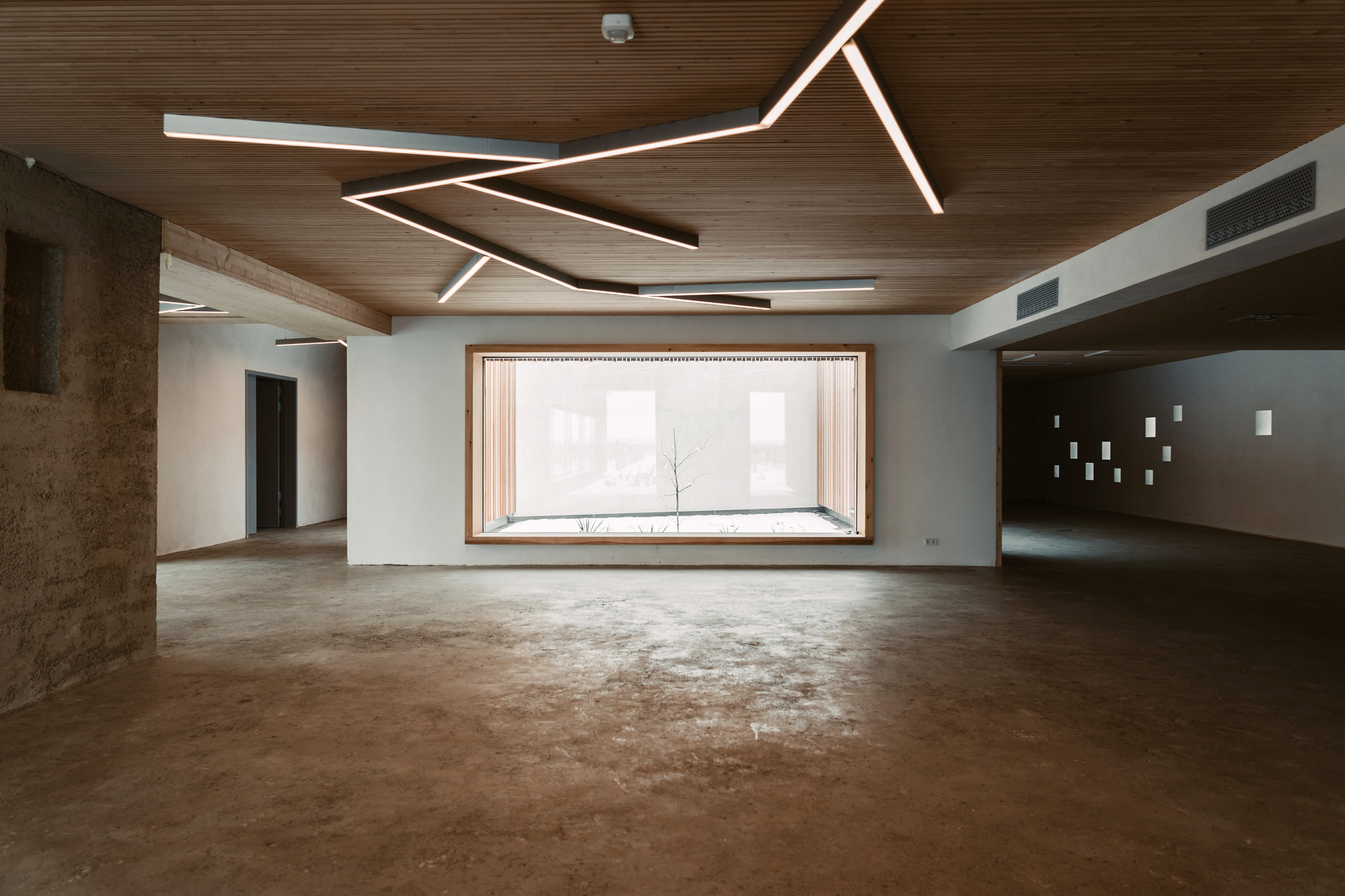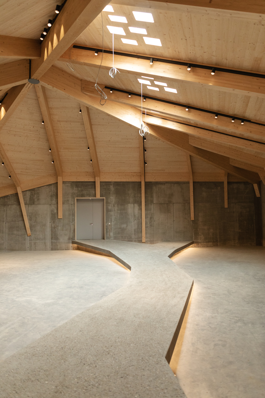 Das Herzstück des Weingutes ist der mittig positionierte pyramidenförmige Bau mit seiner asymmetrischen Holz-Dachkonstruktion. In diesem Raum werden die für die Weinherstellung und die für das Weingut bekannten Ei-förmigen Betongefäße gelagert, ein Betreten und Erleben ist über einen scheinbar schwebenden Steg möglich.