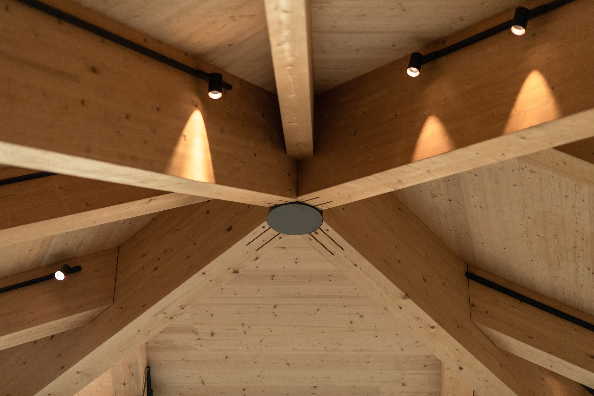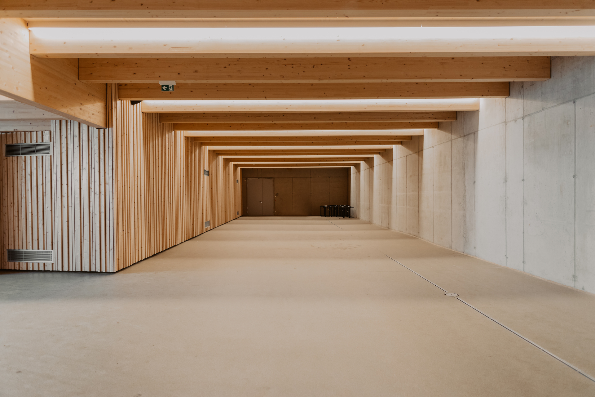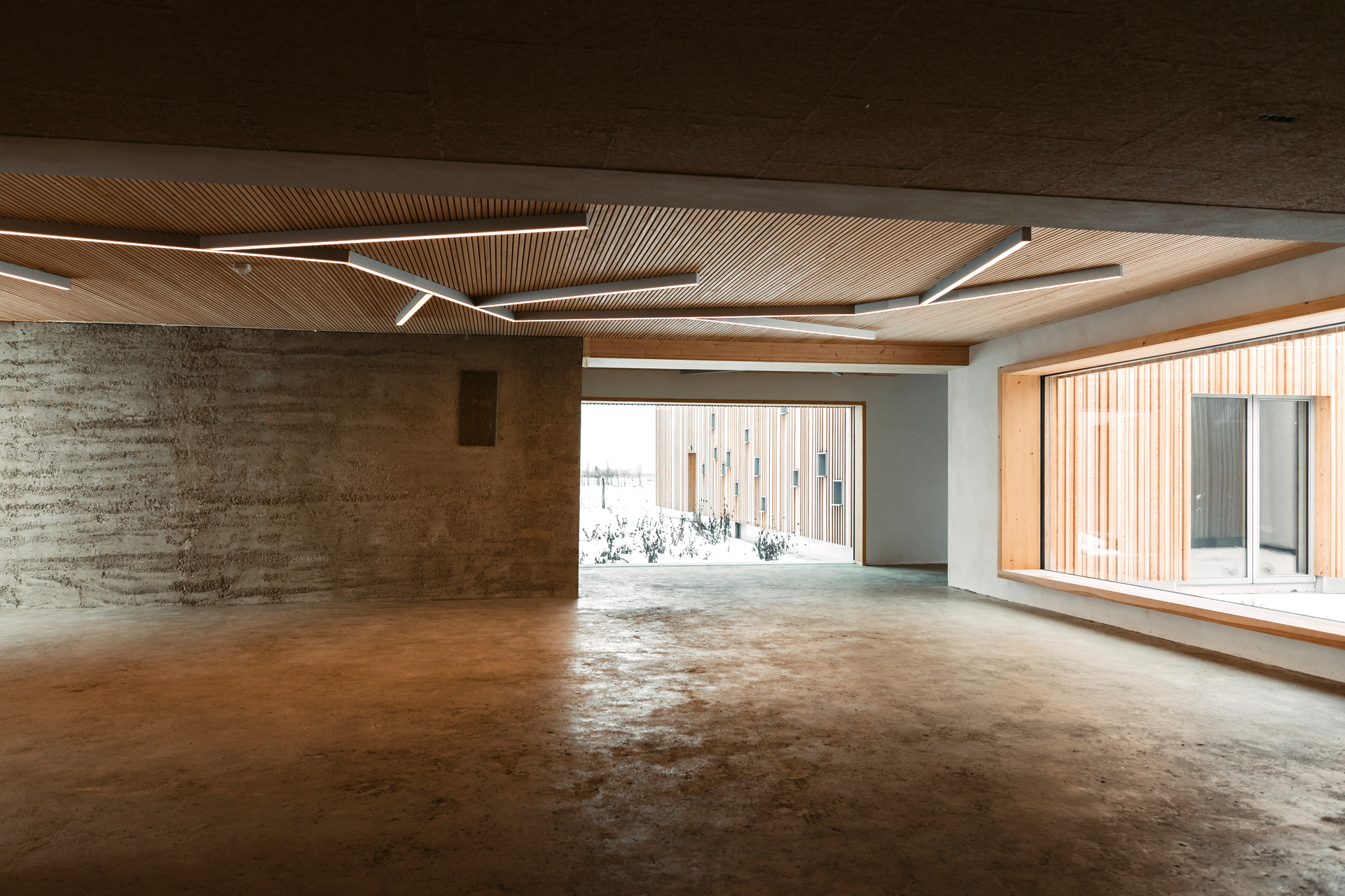 Die Dächer der Baukörper sind begrünt ausgeführt, so wird das genommene Grün wieder zurückgegeben und eine neue Landschaft gestaltet. Die Trag-Konstruktion wurde großteils in Holzbauweise ausgeführt, die Oberflächen aus natürlichen Baustoffen, wie Lehm, Holz und Hanf. Stampflehmwände und -böden prägen die Atmosphäre im Inneren.