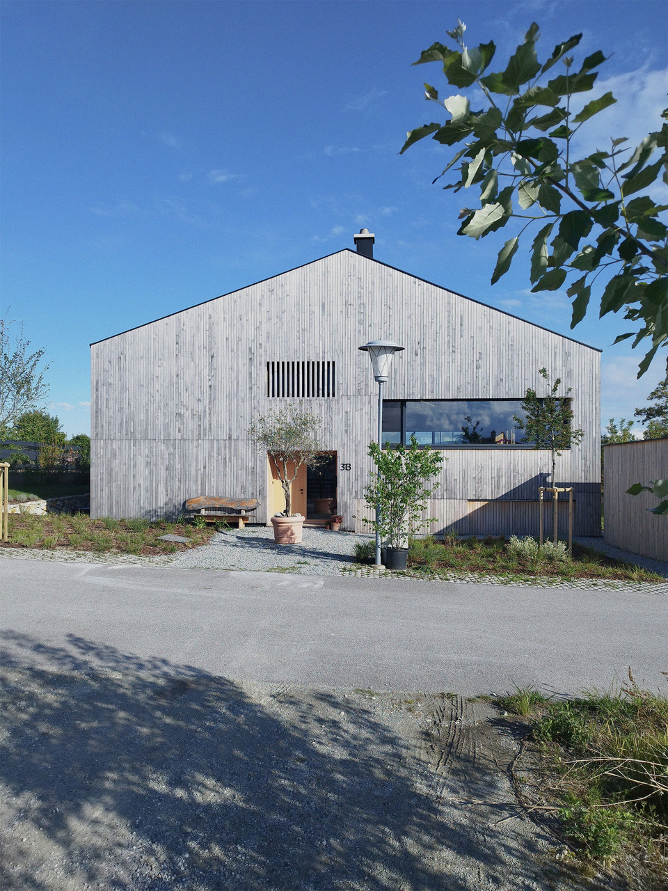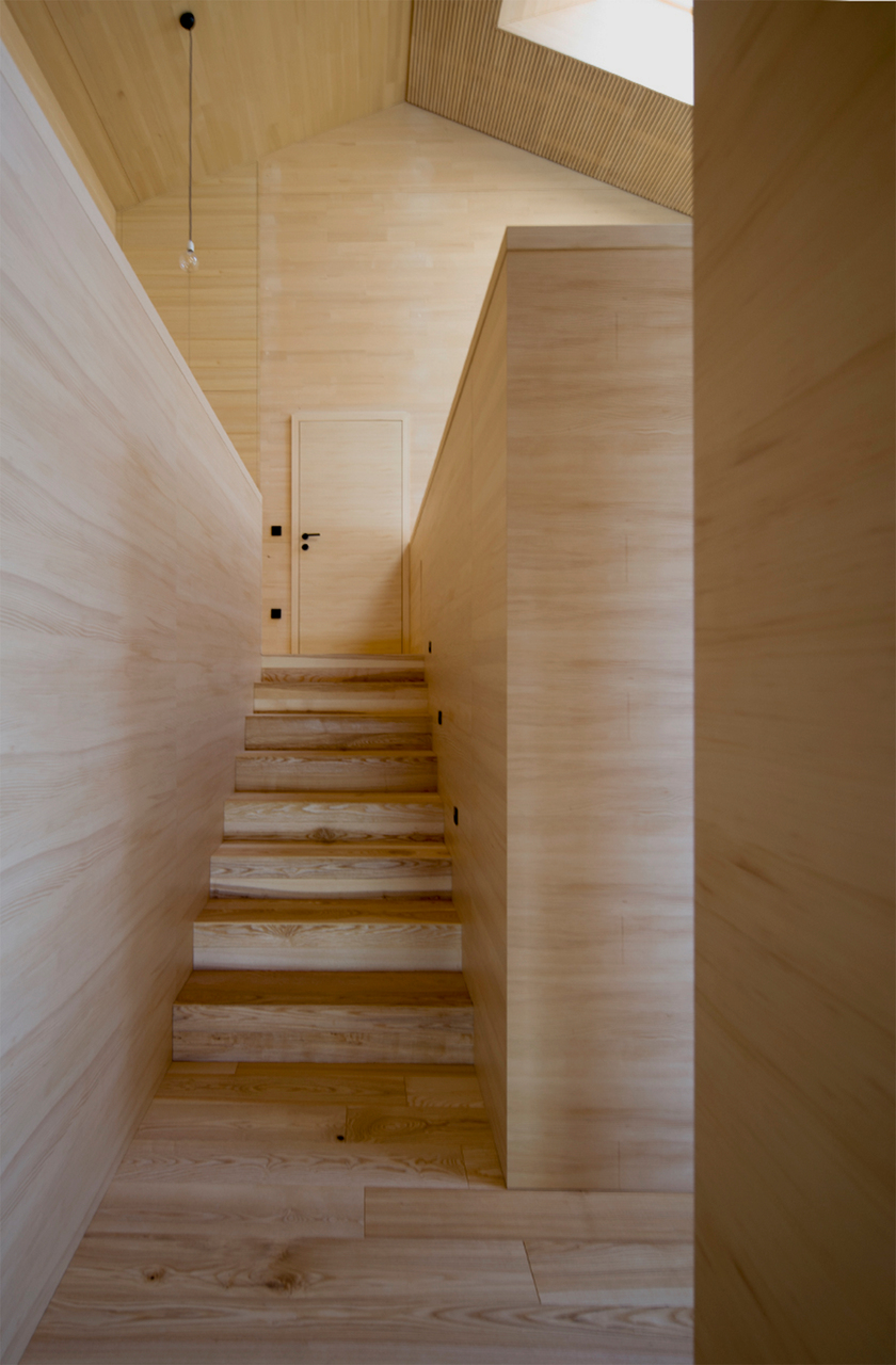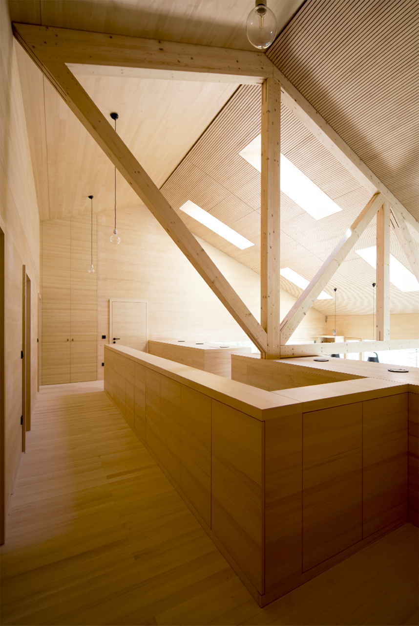 Auf dem massiven Untergeschoss aus Stahlbeton sind 1,5 Massivholzgeschosse aufgesetzt. Die Konstruktion aus Brettsperrholz ist mit Zellulose gedämmt und im Innenbereich mit einer Weißtannendeckschicht versehen. Eine vertikale Lattung aus Weißtanne bildet die Fassade. Das Gebäude wird mit einer Luft-Wärmepumpe beheizt. (Text: Architekt)