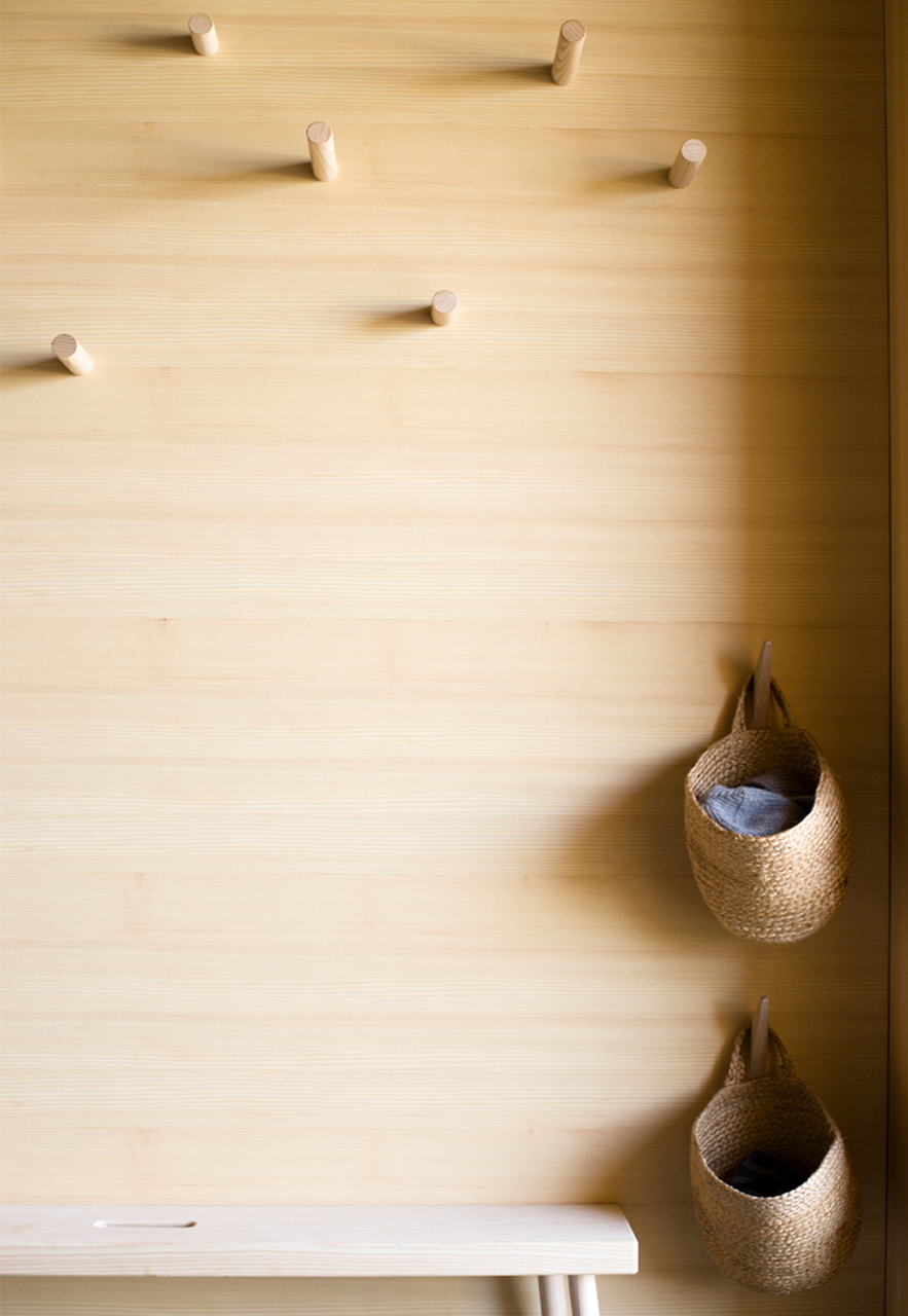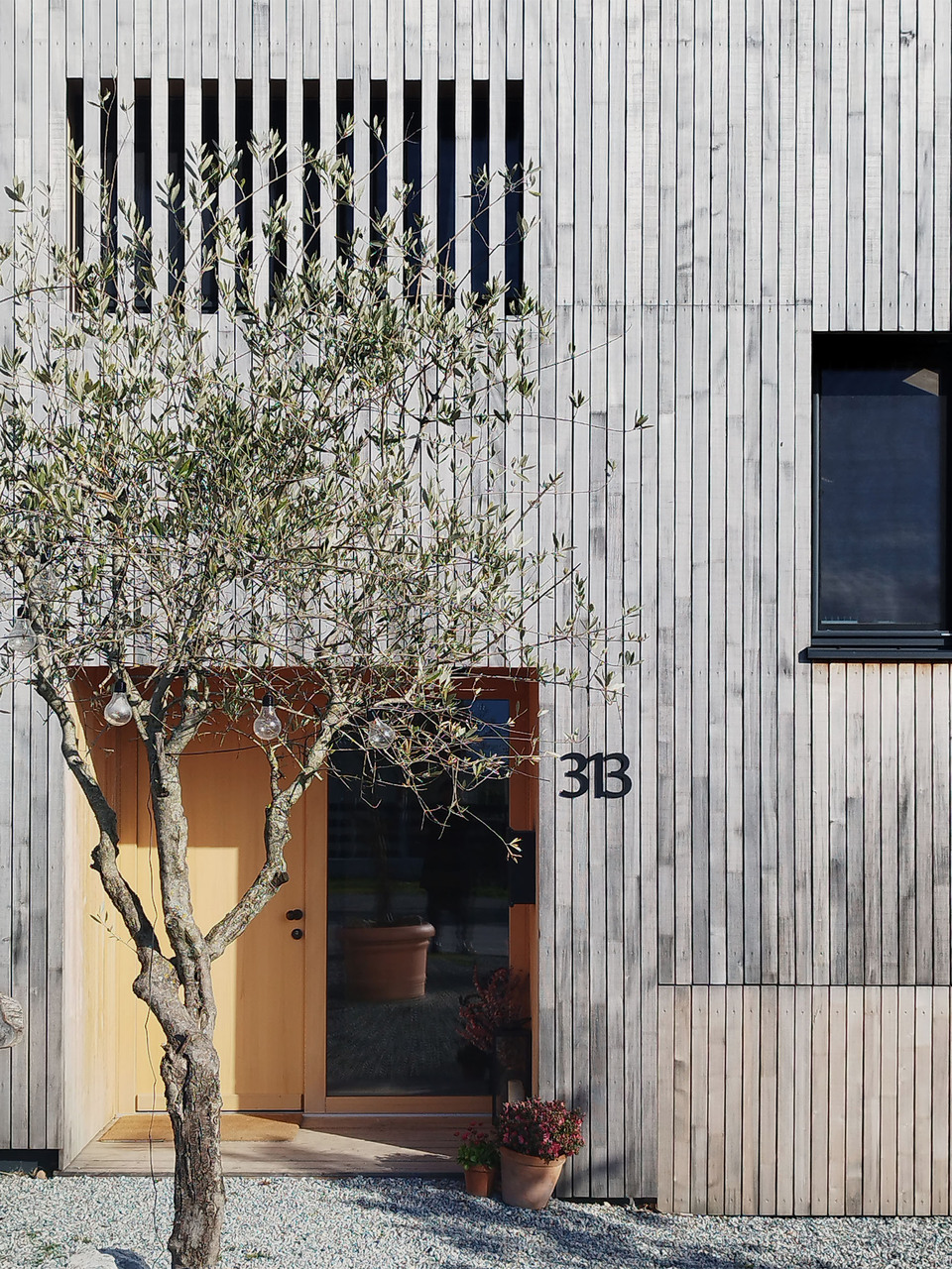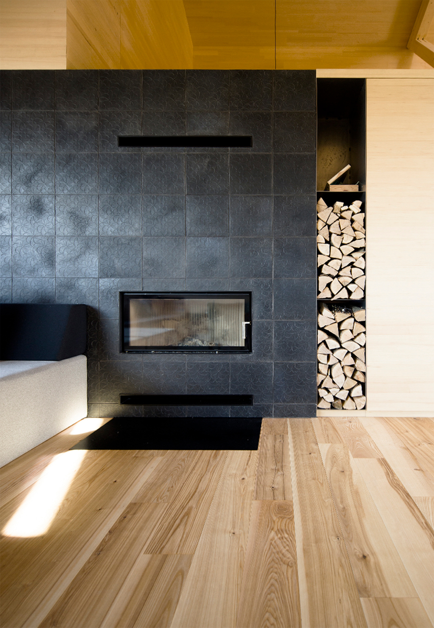 Auf dem massiven Untergeschoss aus Stahlbeton sind 1,5 Massivholzgeschosse aufgesetzt. Die Konstruktion aus Brettsperrholz ist mit Zellulose gedämmt und im Innenbereich mit einer Weißtannendeckschicht versehen. Eine vertikale Lattung aus Weißtanne bildet die Fassade. Das Gebäude wird mit einer Luft-Wärmepumpe beheizt. (Text: Architekt)