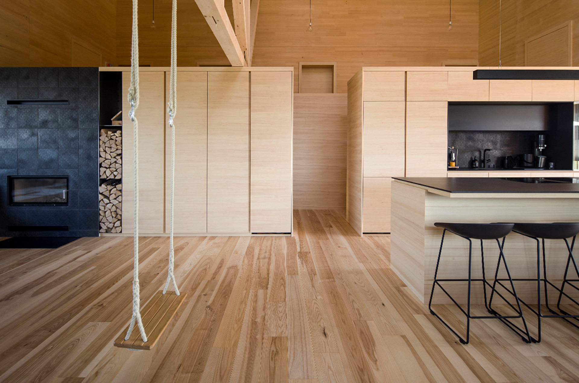 Die Fachwerkskonstruktion in der Wohnküche ermöglicht eine großzügige Raumhöhe und ein offenes Raumgefühl. An die Wohnküche schließt ebenerdig die Loggia an, diese schafft eine geschützte Verbindung in die Natur – wegorientiert von der Siedlung.