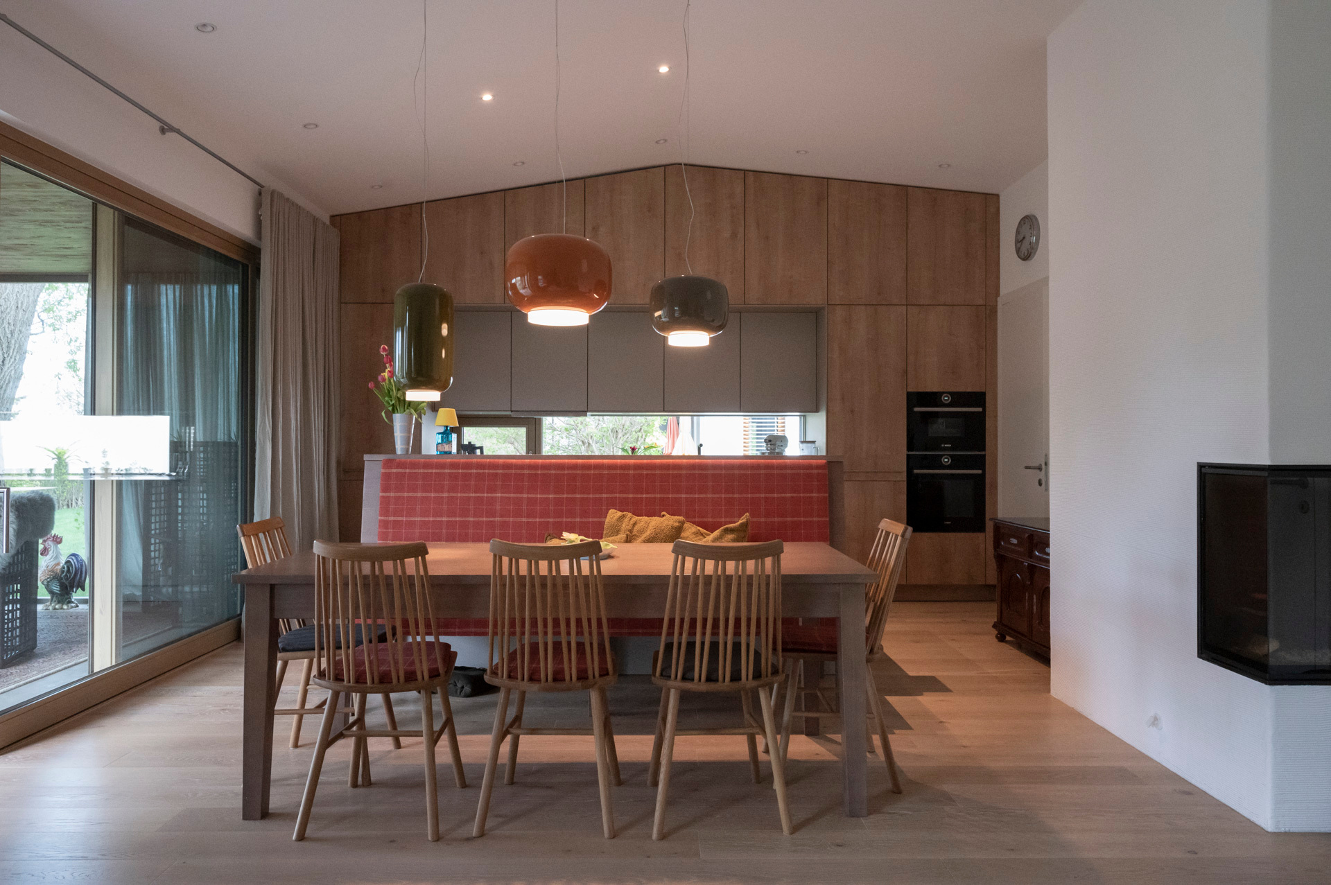 Nachhaltigkeit bestimmt die Wahl der Materialien und das Heiz,- und Kühlsystem. Der Einsatz des zentralen Kachelofens und die Kühlung über die aktivierte Stahlbetondecke ermöglichen ein energieeffizientes Betreiben des Wohnhauses. (Text: Architekten, bearbeitet)