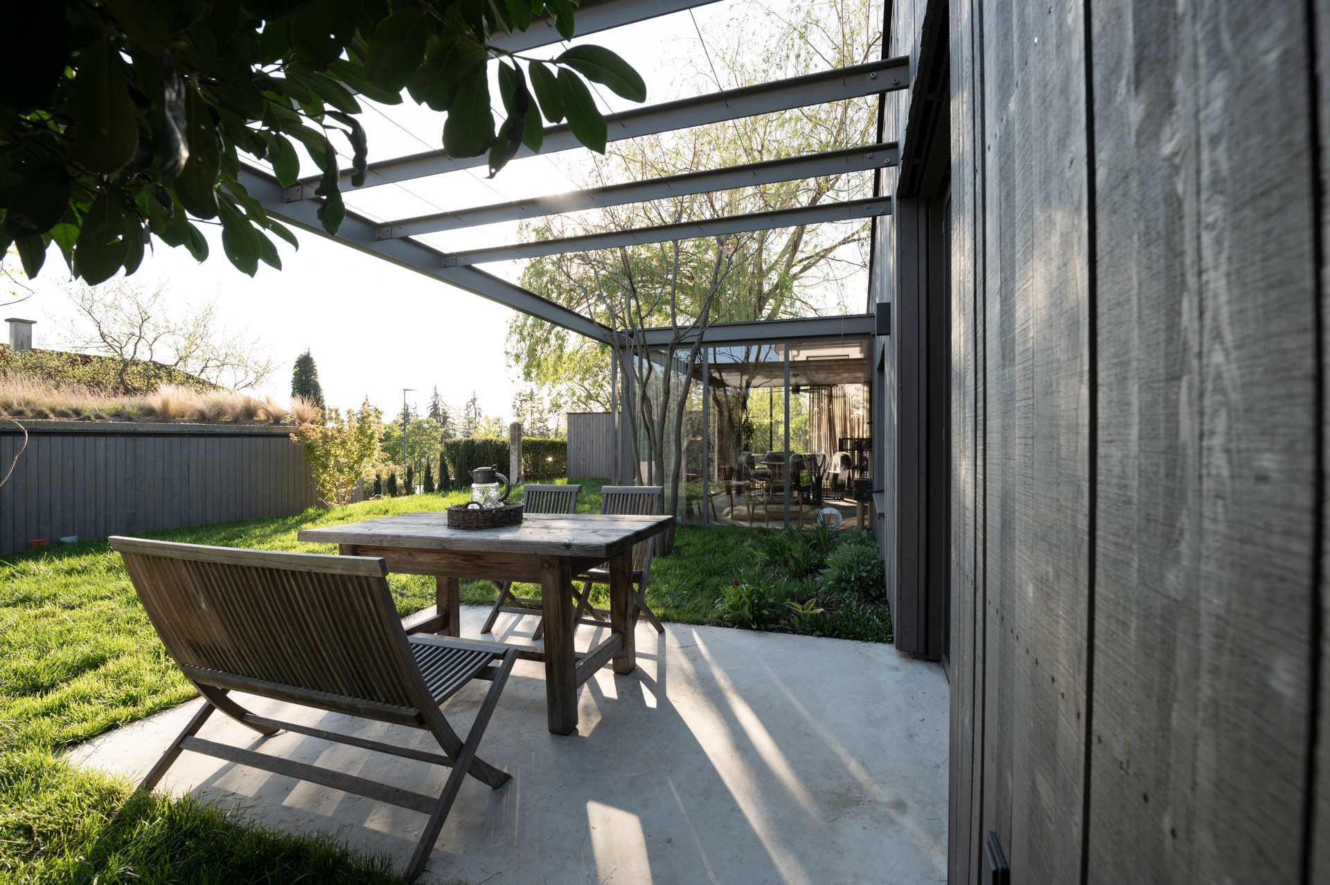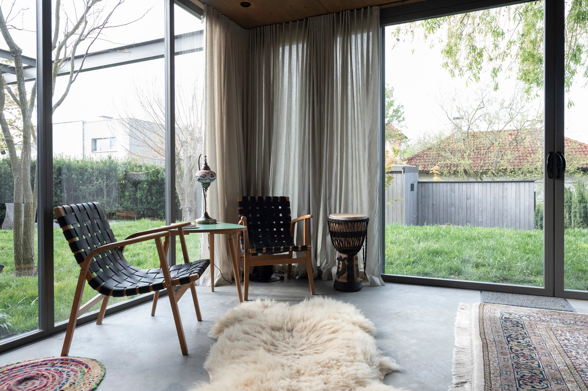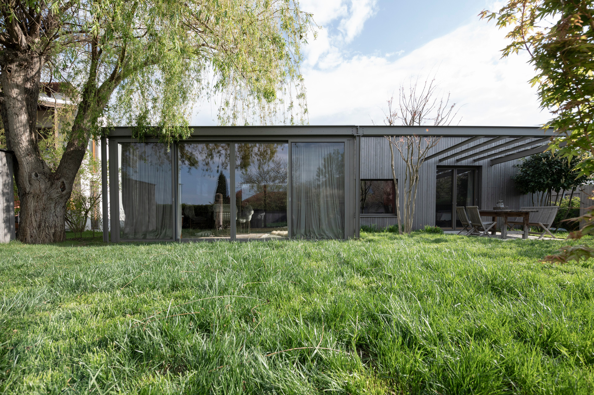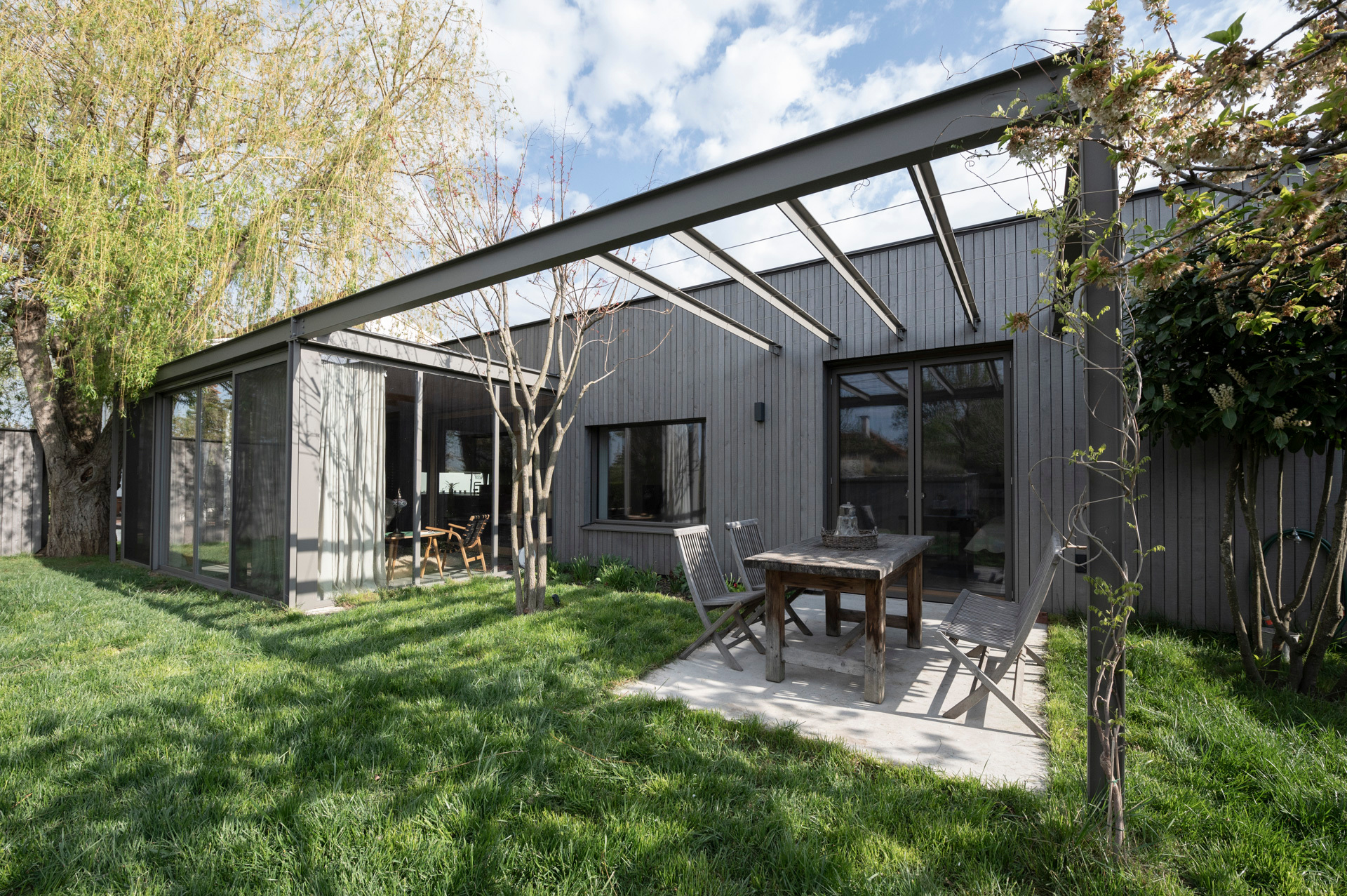 Der Baumbestand im Garten und die Himmelsrichtung bestimmten maßgeblich die Situierung des Gebäudes. Ein zum Altbestand durchlässiger Holzzaun und ein Fahrradschuppen schaffen gemeinsam mit dem Wohnhaus einen privaten Freiraum. Der Wohn- Essbereich und die vorgelagerte Veranda bilden das Zentrum des Wohnhauses. Das Schlafzimmer mit angrenzendem Badezimmer und Garderobe wird vom Wohnraum und Vorraum aus direkt erschlossen. Der Hauswirtschaftsraum kann als Gästezimmer oder Betreuer:innenraum genutzt werden.