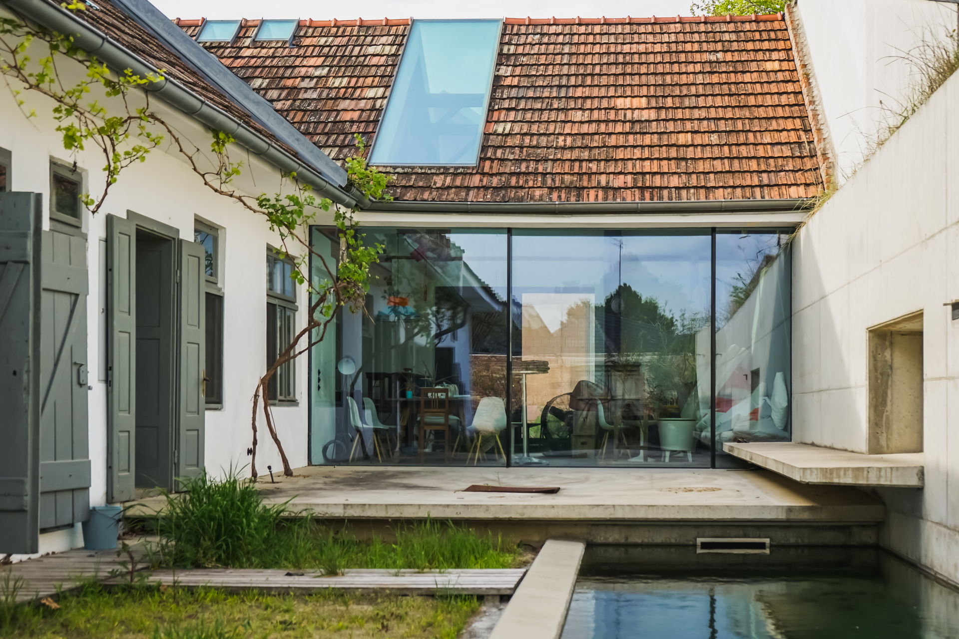 Durch die großflächige, hofseitige Glasöffnung kann der gesamte Wohnbereich zum Garten hin geöffnet und erweitert werden. Der geschliffene Estrich als Bodenbelag geht einheitlich vom Wohnen in die Terrasse über. Der für die Typologie charakteristische Hofraum wird zum zentralen Element.