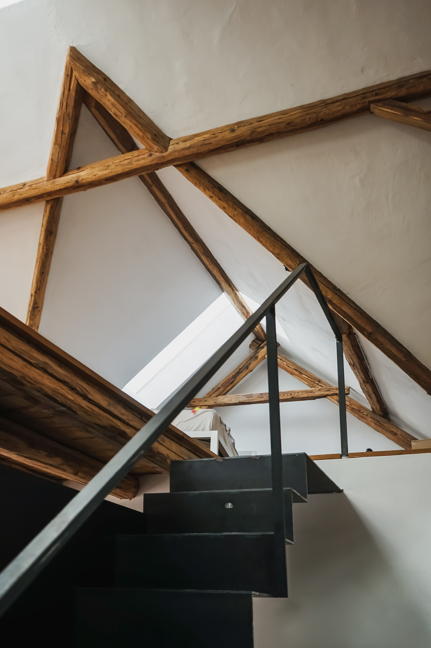 Durch das Öffnen der Wohnraumdecke wird das Zimmermanns-Hängewerk sichtbar und ein Galeriegeschoß als Arbeitsbereich geschaffen.