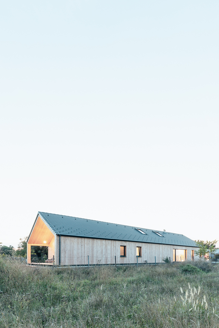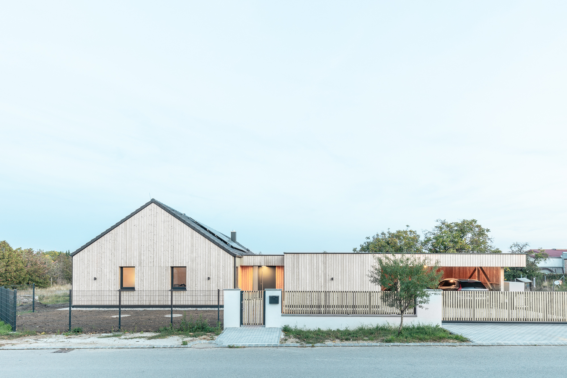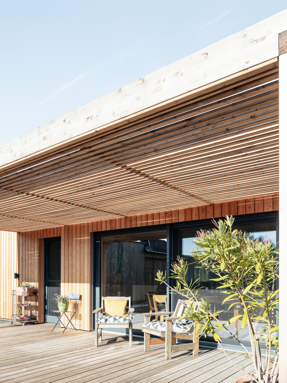 Gemeinsam mit dem nordwestlich anschließenden Gebäudeteil, welcher den Eingangsbereich, Nebenräume und Carport beinhaltet, entsteht eine L-förmige Gebäudestruktur, die einen vor Wind und Blicken geschützten Garten umgibt.