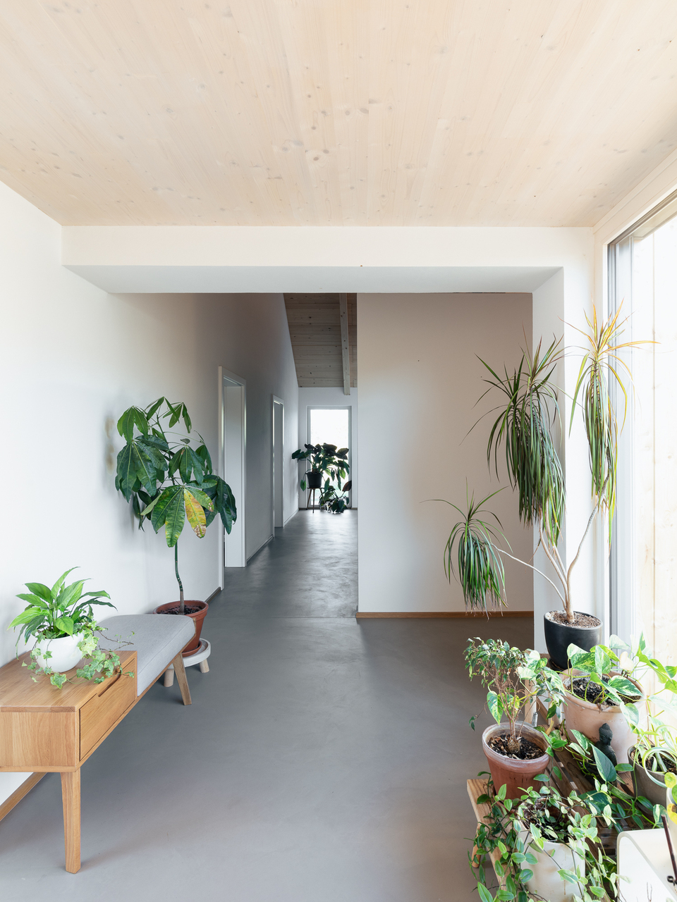 Der bewusste Einsatz von baubiologisch unbedenklichen Materialien, wie vor allem Holz, sowie eine Reduzierung der Schichten im Wand- und Dachaufbau wurden in enger Abstimmung mit der/dem Bauphysiker:in umgesetzt. Die innere Dachschalung ist aus 3 cm starken GFM-Platten ausgeführt, die gleichzeitig als Dachuntersicht und Sichtflächen fungieren. GFM (Glue Free Massiv) ist eine hoch luftdichte Massivholzplatte durch deren Einsatz auf Folien und Klebebänder verzichtet werden kann. Im Holzriegelwandaufbau wird auf eine außenliegende Windfolie verzichtet, da die äußerste Schicht als geschlossene Holzfassade mit einer Boden-Deckel-Schalung aus unbehandelten, stehend montierten Lärchenhölzer ausgeführt ist. Im Inneren sind die Wandoberflächen mit Lehm verputzt. Als Putzträger für den Lehm dienen Holzweichfaserplatten, welche auf emissionsarmen und mit blauen Engel zertifizierten ESB-Plus Holzwerkstoffplatten montiert sind. Wand und Dach sind mit Zellulosefasern - ein Dämmstoff, welcher im Recycling-Verfahren aus Tageszeitungspapier hergestellt wird - gedämmt.