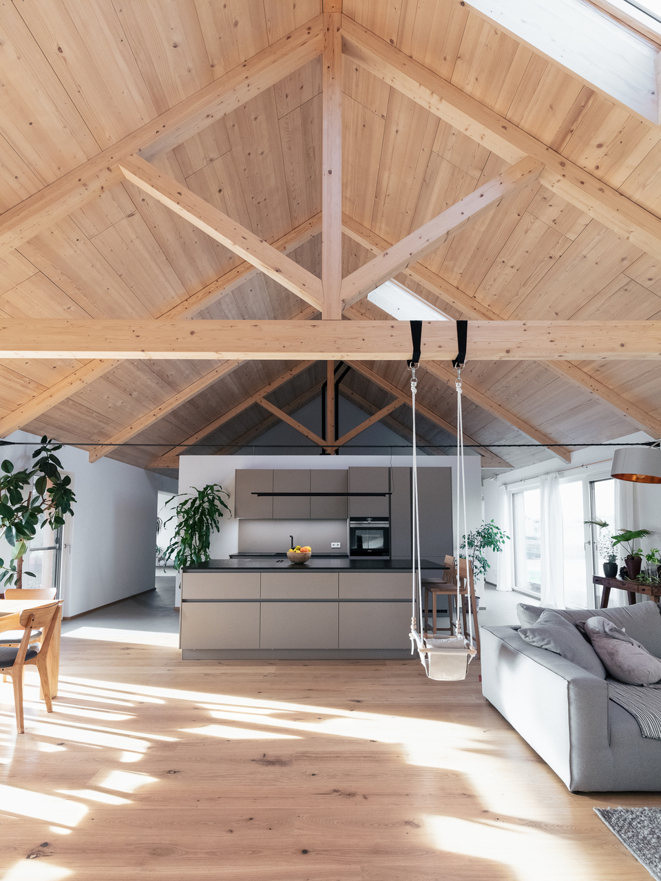 Das Zentrum des Hauses ist der bis zur Dachuntersicht offene Wohn-, Koch- und Essbereich. Zwei Hängewerke ermöglichen einen großen stützenfreien Raum und gliedern das Raumvolumen. Ein frei im Raum stehender Kubus, welcher Nassräume und Speisekammer beinhaltet, gibt dem Eingangsbereich und dem Wohnbereich räumlich die nötige Distanz. Der offene Wohnraum orientiert sich in den intimen Garten und wird an den Giebelseiten von Schlaf- und Nebenräumen umschlossen. Eine großzügige Holzterrasse mit schattenspendender Pergola vergrößert den Wohnbereich nach außen. Dachflächenfenster erhöhen den Tageslichteintrag und sind zur sommerlichen Nachtkühlung und Lüftung vorgesehen. Architekt:innen, bearbeitet