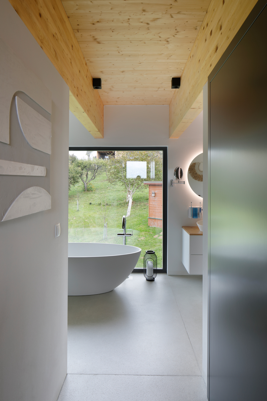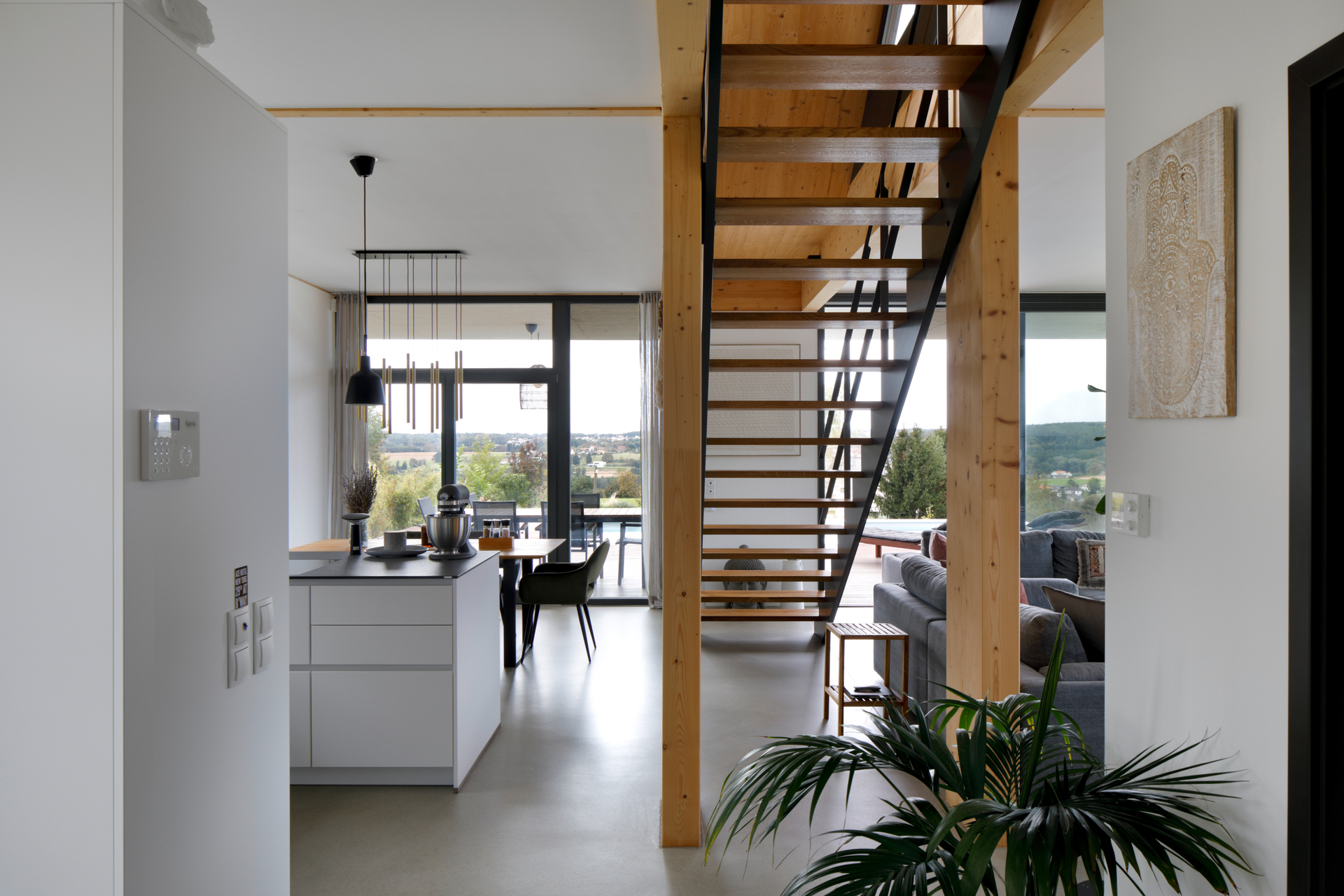 Ein außenliegender, beweglicher Sonnenschutz wird dort vorgesehen, wo die Vordächer keine ausreichende Beschattung bieten. Die Beheizung und die Warmwassererzeugung des Gebäudes erfolgen mittels einer Luft-Wasser-Wärmepumpe, die Wärmeabgabe über eine Fußbodenheizung. (Text: Architekt:innen, bearbeitet)