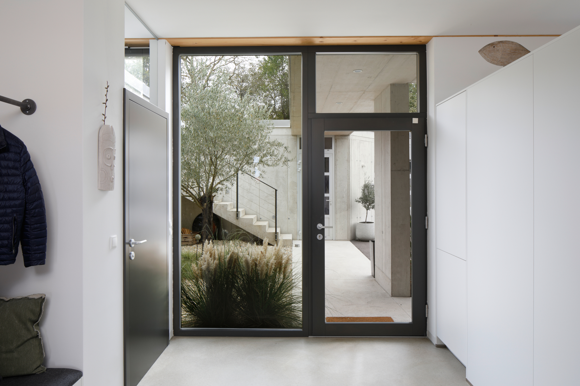 Der gedeckte Zugang setzt sich als Vordach fort, welches sich um das gesamte Erdgeschoss in unterschiedlicher Tiefe zieht, und wird punktuell auf Wandscheiben aus Stahlbeton gelagert. Richtung Süd/Südwest erhält man dadurch einen großen überdachten Terrassenbereich.
