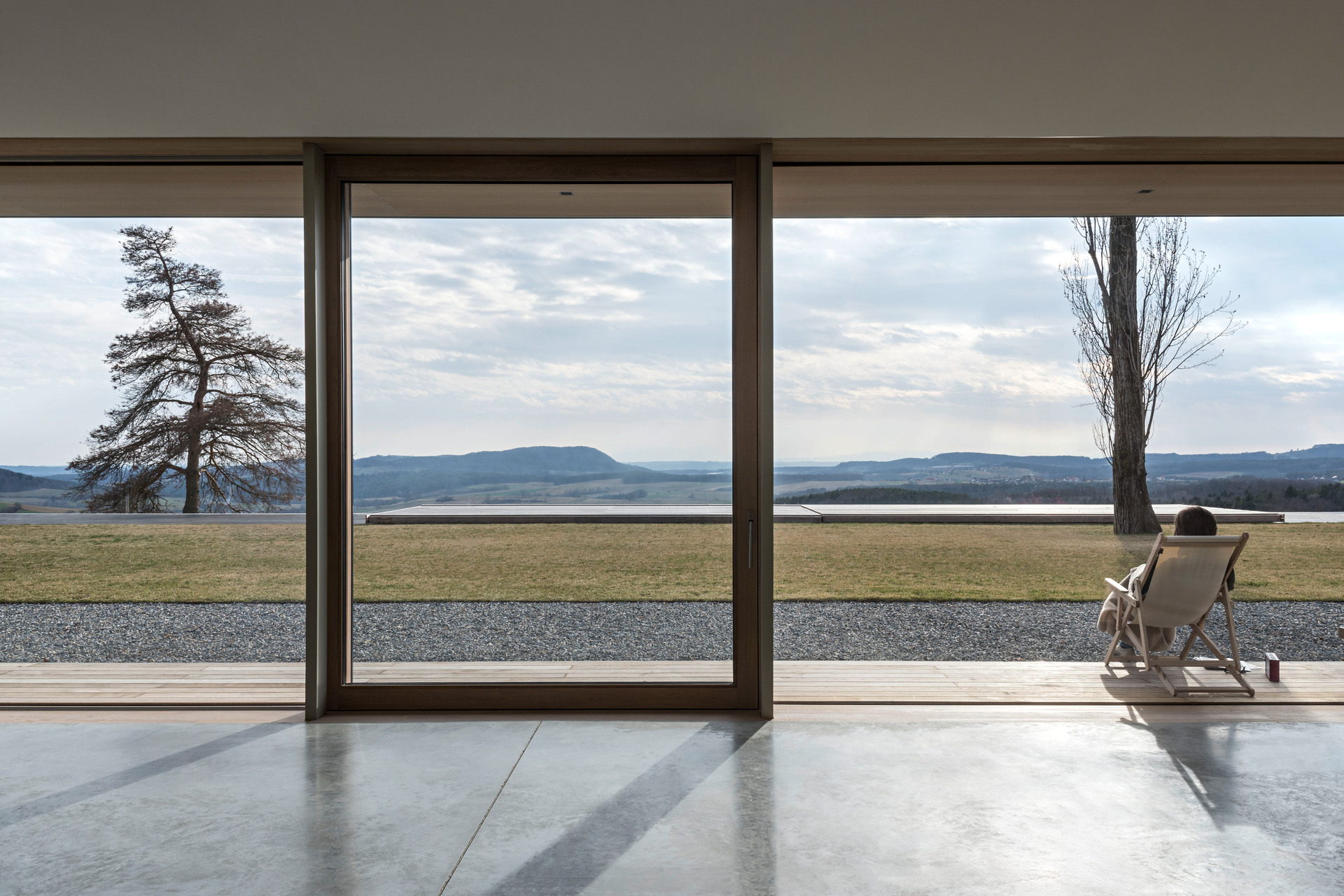 Als Sonnen- oder Sichtschutz bestimmen die Fassadenelemente wiederum wesentlich die Beziehung in den Außenraum, der mit seinem Panorama zur erheblichen Präsenz für den Innenraum werden kann und soll.