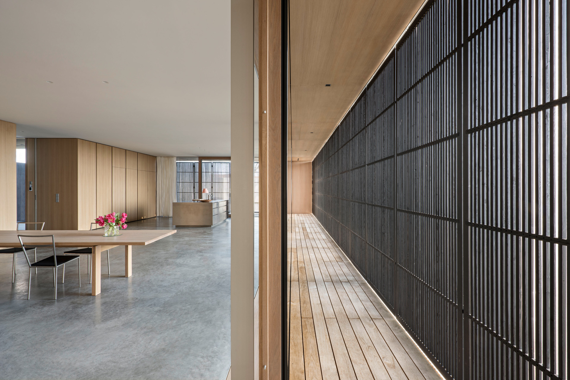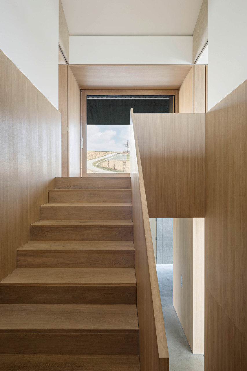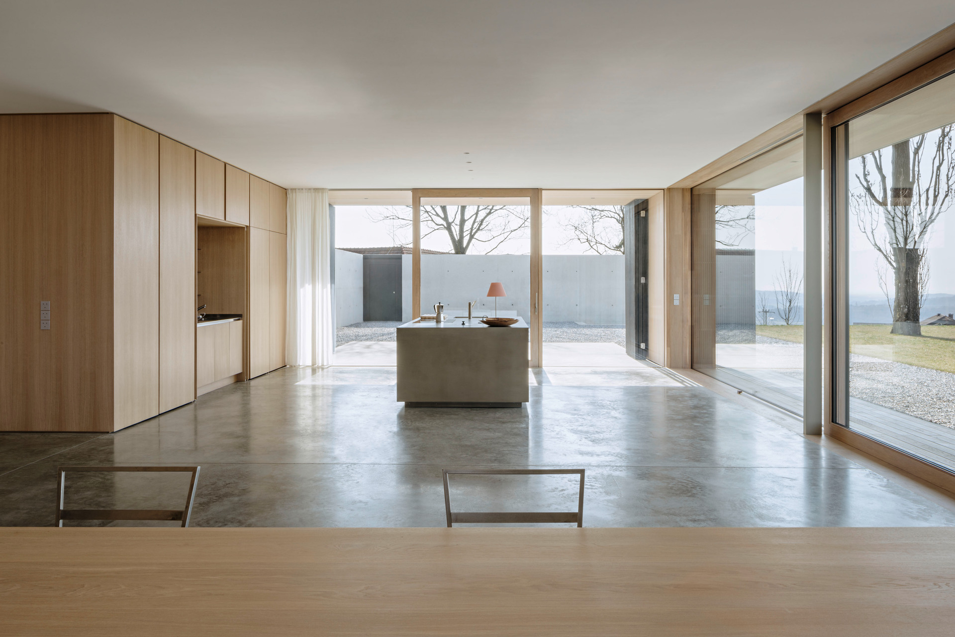Das Programm für das Haus verlangte nach einem hohen Maß an Flexibilität, mit Räumen weitgehend ohne funktionale Prägung, die variable Nutzungsmöglichkeiten zwischen Wohn- und Arbeitsbereichen zulassen und damit innerhalb der Struktur auch beliebig angeordnet werden können. Eine Entlastung des Grundrisses erfolgt mit einem vertikalen Körper, der über beide Geschoße sämtliche Funktionsbereiche aufnimmt und gemeinsam mit der Treppe die Gliederung innerhalb des Gebäudes in ihrer räumlichen Offenheit, wie auch ihren möglichen Formen der Verfügbarkeit wesentlich bestimmt. Zwischen den Aufenthaltsräumen wird der Übergang ausschließlich mit Schiebetüren eingelöst, die sich mit ihrer Mechanik im geöffneten Zustand gänzlich der Wahrnehmung entziehen, um damit der Vorstellung von einer variabel veränderbaren Raumstruktur auch im Detailbereich entgegenzukommen.