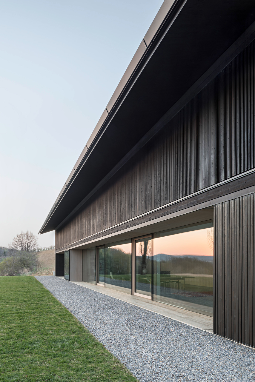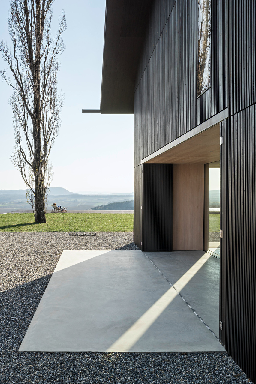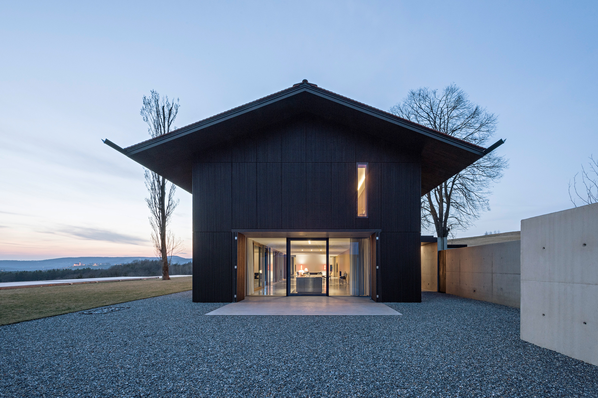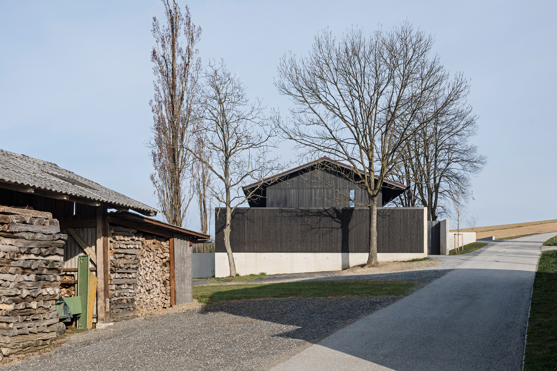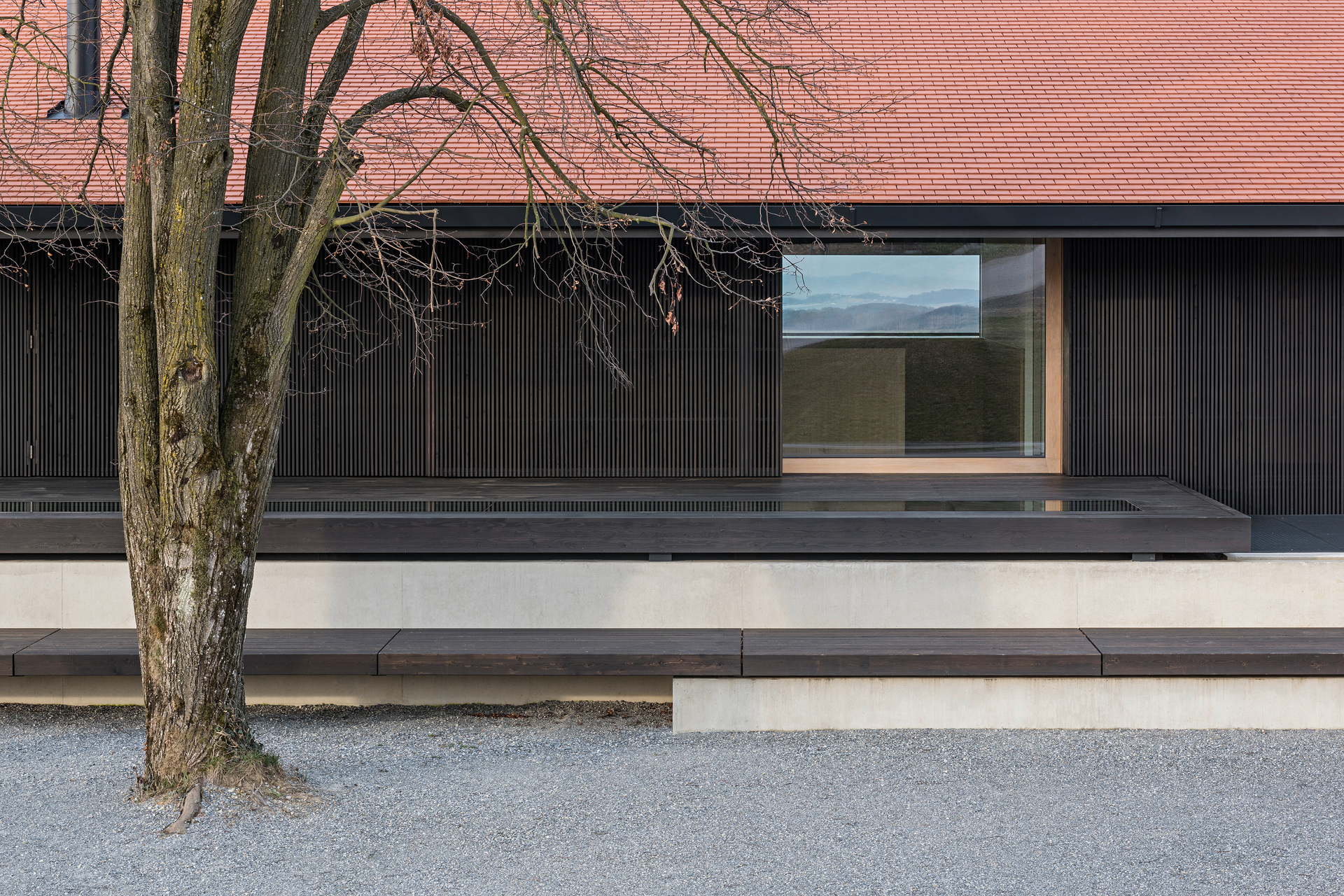 Zum Untergrund bildet eine Betonplatte, zum Hang eine Betonstützwand den Hintergrund, der die Holzkonstruktion des Gebäudes aufnimmt. Die lokalen Baubestimmungen im Landschaftsschutzgebiet forderten ein Satteldach mit geradem Firstverlauf, das aber für dieses Projekt nicht die einzige Referenz zur lokalen Bautradition darstellt, sondern auch in der Fassade ihre Übersetzung in die Gegenwart erfährt. Die Fassadenelemente bestehen aus Teilen gleicher Bauweise, die, entweder fix oder mobil, die Wandelbarkeit der Fassade regeln. Das auskragende Dach kann hier auch als erheblicher Schutz für die Fassadenstruktur gegen Witterungseinflüsse verstanden werden.