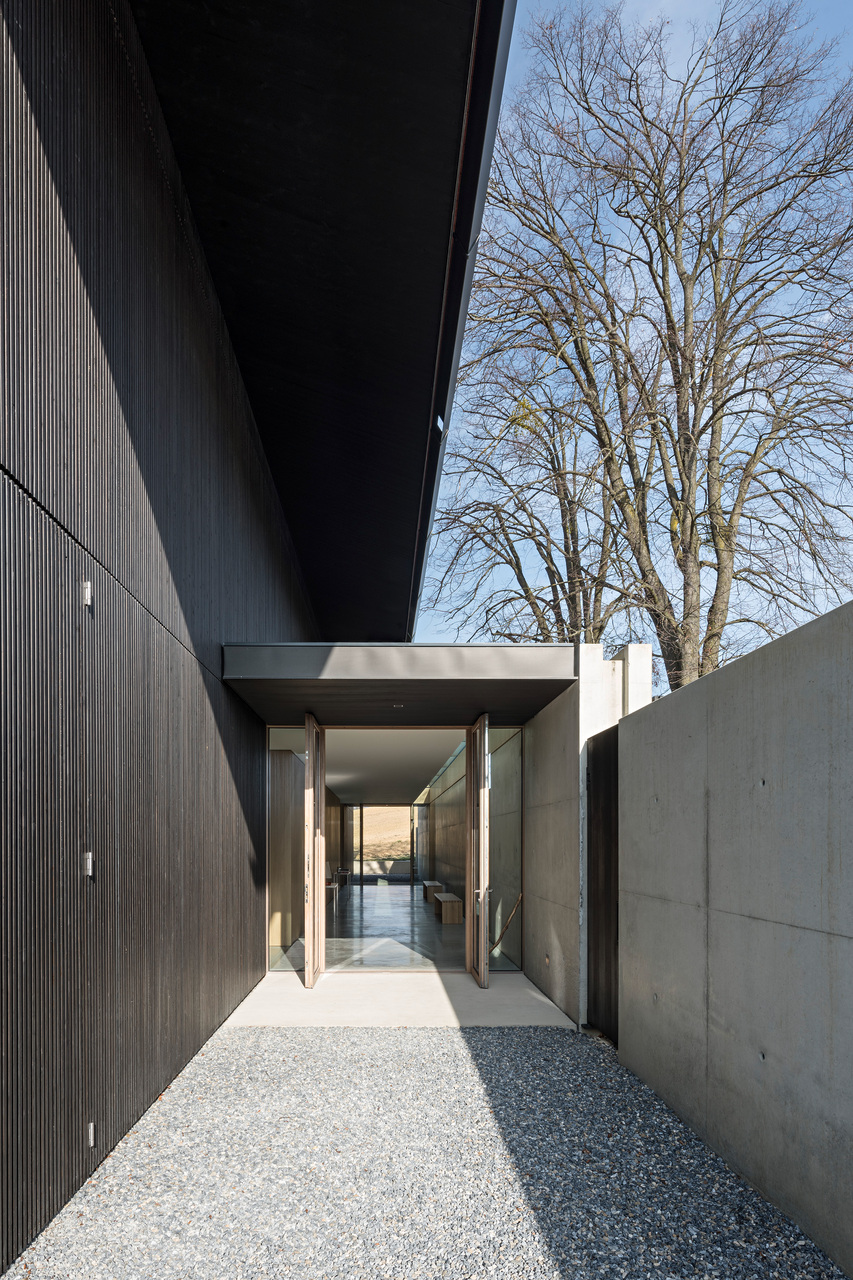 Mit der Anordnung des Gebäudes auf der Grundstücksfläche entsteht zwischen dem Gebäude und der Geländestützwand ein Eingangsflur, der als klimatischer Pufferraum zu verstehen ist, der mit seiner Speicherkapazität das Klima im eigentlichen Gebäude in passiver Form mitbestimmt. Das linear entlang der Betonspeicherwand ausgerichtete Oberlicht ermöglicht einen zusätzlichen Sonneneintrag in Ost-West-Orientierung, der für eine temporäre Erwärmung der Wandoberfläche einen Beitrag leisten kann und darüber hinaus für einen dosierten Tageslichteintrag in den Übergangsbereich sorgt.