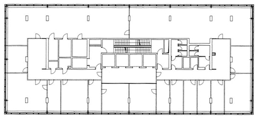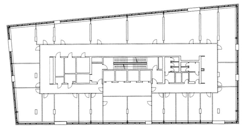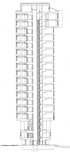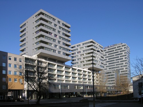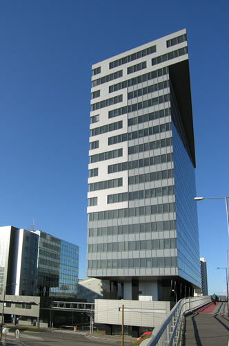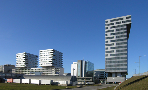 Ľubomír Závodný on the recently heavily urbanized Einstein street in Petrzalka. Already his Depaertment store Atrium showed that the traffic belt isolating Petrzalka from the Danube river bank on north is not necessarily a barrier to quality architecture at all. TatraCity creats a larger urban block with horizontal body and three articulated towers of maximum 15 and 19 floors. The highest administrative tower becomes a point of orientation from east while the housing volumes cultivate the existing urban landscape. Peter Szalay