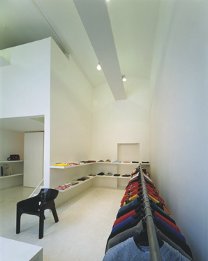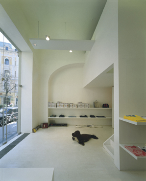 Die Fassade in der sonst mit konservativen Geschäften ausgestatteten Innenstadtgasse wurde gleichsam als Lochbild in der bestehenden Straßenfassade herausgearbeitet und mit einer stadtteil-unüblichen Überhöhung der Sockel- und Geschäftzone versehen.Innen dominiert die Farbe Weiß: von der Decke bis zum Boden, die übriggebliebene Lagerfläche einer ehemaligen Zwischendecke wird als zusätzliche Ebene integriert. Scheinbar unspektakulär und doch außergewöhnlich: