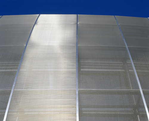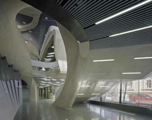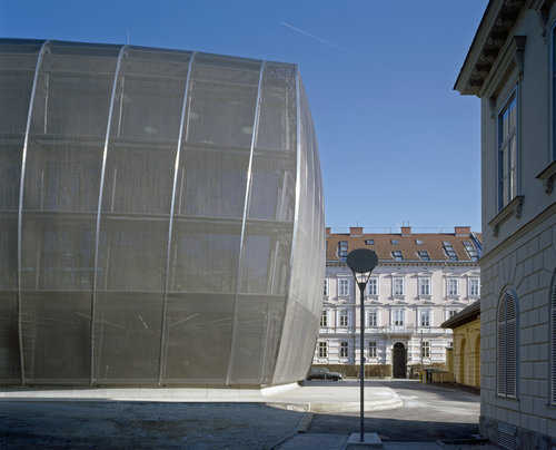 Die beiden Längswände des Saals sind über das Saalende hinaus gekurvt ins Foyer gezogen und verdrehen sich – ähnlich einer Bandschleife – in die Horizontale und weiter zu einem plastischen Element in komplexer räumlicher Geometrie, das Lasten abtragend fungiert. Dieser von seinen Erfindern „Twist“ genannte Kern aus betonierten, mehrfach räumlich gekrümmten Flächen bildet das rauminnere Auflager für die radial angeordneten Deckenträger des großen Foyers im ersten Obergeschoß und des darüber situierten Theaterproberaums. Seine äußerst aufwendige Herstellung erforderte eine speziell entwickelte Schalungstechnik und enorme Präzision in der Ausführung. Dieäußeren Deckenlasten an der Fassade jener Räume, die durchgehend verglast sind, werden nun ganz konventionell in eine regelmäßig unterteilte Reihe schräg gestellter Stahlstützen eingebracht. Den gewünschten Eindruck einer fließenden Hülle erzeugt ein Netzaus Metallgewebe, das rundum – vor Glas und Beton – über den thermischen Raumabschluss gespannt ist. Die gebauchte Form dieser zweiten Haut, vor allem ihre radialen Biegung in Bodennähe, ist deutlich als Reminiszenz an das ursprünglich gewollte Erscheinungsbild des Spiralkörpers zu sehen.