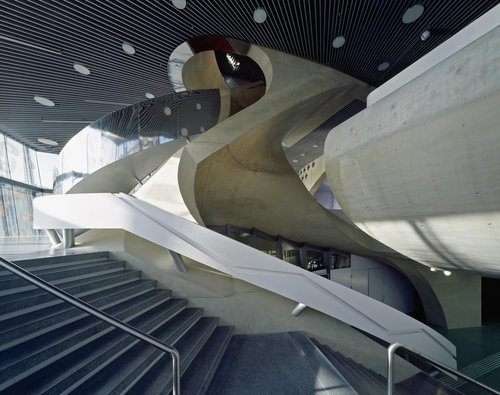 Von räumlichen Verknüpfungen, die durcheine mäandrierende spiralförmige Organisation erzeugt werden sollten, ist außer in der vertikalen Durchlässigkeit des Twists nicht mehr viel zu sehen. Was man im realisierten Projekt des Mumuth ebenso vermisst, ist die dynamische Raumkonzeption entlang einer Bewegungsachse, wie sie vor allem den viel gepriesenen, räumlich-komplexen Bau des Mercedes-Benz-Museums in Stuttgart (2006)auszeichnet, in dem aus geschlossenen Räumen, offenen Ebenen und Schrägflächenspannungsreiche Raumsequenzen erzeugt wurden, die entlang von zwei sich kreuzenden Rampen inszeniert werden.