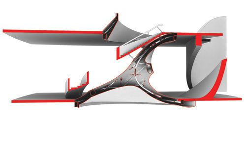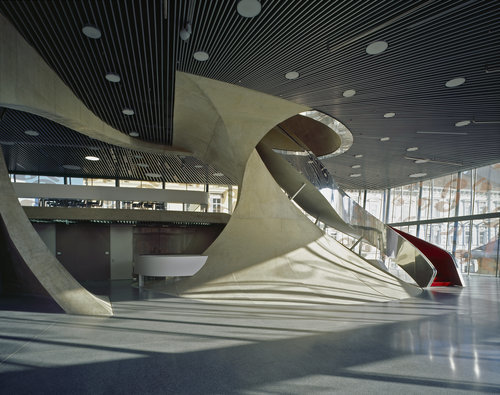 Kein Konflikt für den smarten Holländer, derseine eigens entwickelten EntwurfsstrategienDesignmodelle nennt. Er vereint beide Ideologien in seinem Modell „From Box to Blob and back again“, indem er eine lineare Spiralstruktur aus der Geometrie der Box herausin eine weiche Bewegung, den Blob, transformiert und sie zum Futteral für daraus abgespaltete kleine Spiralen macht, die, ihre Richtung ändernd (back again), zum komplexen internen räumlichen System werden. – Was kompliziert klingt, war auch so, denn die spiralförmige Struktur, die als Stahlkonstruktion tragende Funktion übernehmen sollte, erwies sich auch in der Form des überarbeiteten Entwurfs als nicht realisierbar.