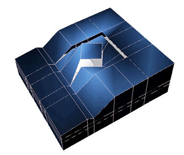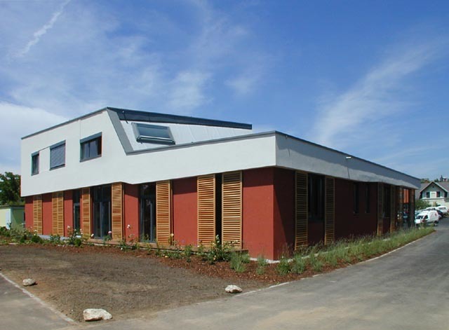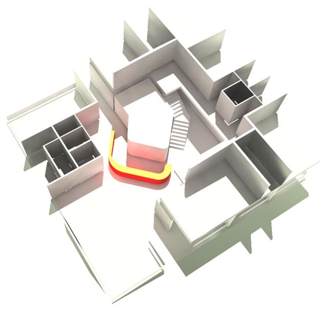 Durch eine Verdrehung im Zentrum des Gebäudes entsteht eine innenräumliche Insel, die in der Dachfläche fortgeführt einerseits diese aufbricht und für Belichtung sorgt, andererseits zum Teil als Dachterrasse ausgebildet wird. Rund um diese zentrale Insel, die als Anmeldung, Röntgenraum und Teeküche und als Erschließungsraum für das Keller- und das Obergeschoss ausgebildet ist, reihen sich die verschiedenen Arztpraxen: Im Kellergeschoss eine Einlegerordination für Heilmasseurin und Physiotherapeut sowie Umkleiden und Nassräume für die Angestellten, im Erdgeschoss sechs Zahnbehandlungsräume und eine Einlegerordination für eine Frauenärztin, einen Arzt für TCM (Traditionelle Chinesische Medizin) und einen Orthopäden, im Obergeschoss Räumlichkeiten für Zahntechnik, ein Ärztebüro und einen Sozialraum mit Terrasse.