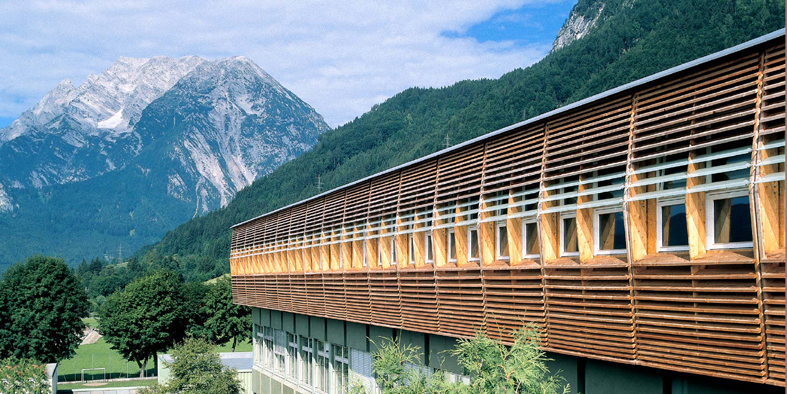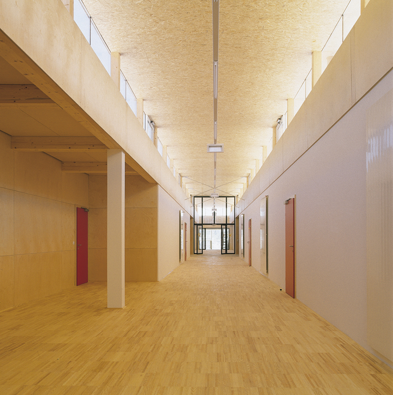 Hier setzt der Zubau in seiner Stärke aus Funktionalität und Logik an: Mit dem statischen Nachweis der Festigkeitszunahme des Betons infolge von Alterung und der extremen Leichtkonstruktion konnte ohne Verstärkung des bestehenden Betonbaus die Erweiterung um 1.200 m² Nutzfläche nicht nur in sehr kurzer Bauzeit realisiert werden, es konnte auch das Hofmilieu in Form attraktiver, begrünter Freiflächen erhalten bleiben, eine der wenigen Attraktionen der bestehenden Schule. Die trockene und saubere Bauweise durch im Werk vorgefertigte Wandtafeln mit werkseitig eingebrachten Installationen vermied mögliche Bauschäden gegenüber einer offenen Konstruktion vor Ort.