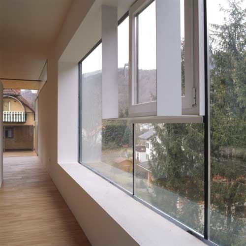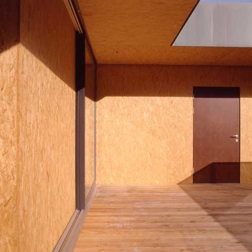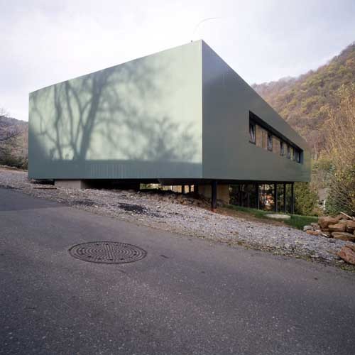 Knapp 30 Meter breit, fast ebenso lang liegt der felsige Grund an einer ansteigenden Strasse im Süden, bis zur Nordbaulinie fällt er fast vier Meter, zur Grundgrenze fast zehn Meter ab. Um den Garten zu wahren und dem Wohnen auf einer Ebene Privatfreiraum zu schaffen, wurde das Fundament als Plattform fürs Leben vier Meter hochgehoben. Wie am Tablett schwebt der klare Baukörper mit Innenhof und Talblick auf elf zarten eingespannten Stahlstützen über Hang und Nachbarn, ohne deren Sicht zu stören. Lasten-kosten- und bauzeitminimierend sind Dach und witterungsexponierte Außenwände des vorgefertigten Holzleichtbaus mit Alwitra- Folie überzogen, dem gedeckten Wohnweichteil um den Hof am Hochplateau genügen die konstruktiven OSB-Platten als schöne, warme Oberfläche. Estrich und Zwischenwände wirken als Speicher, die vordachbeschattete, raumhohe Fixverglasung ist ein Wärme, Süd-Westsonnen- und Blickfänger. Ein horizontales Fensterband am ostflankierenden Schlaftrakt, Eichenparkett, Kamin und Oberlicht schaffen luftig-wohlige Atmosphäre im engen, grünen Bachtal.