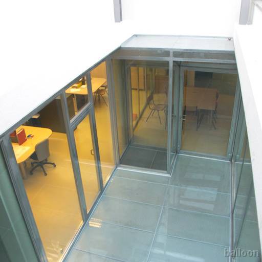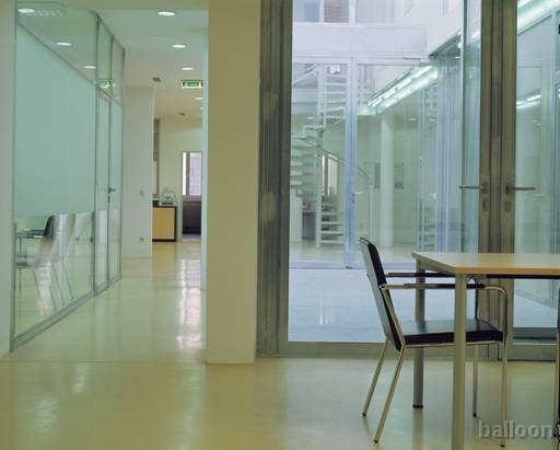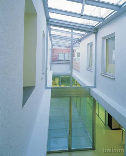 Ebenso wurde die Westfassade in Richtung Nachbarhof geöffnet und zusätzlich Licht und neue Ausblicke geschaffen. Um das zentrale Elemet des Lichthofes wurde das 1. und 2. Obergeschoß über ein 2-geschoßiges Foyer mit einer Wendeltreppe verbunden und zu einer Betriebseinheit von ca. 600 m² zusammengeschlossen. Durch die Transparenz nach Innen mit mehreren Aufenthaltsbereichen wurde ein angenehmes Betriebsklima geschaffen. (Text: balloon)