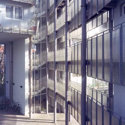 Die großzügigen Gartenhöfe zwischen den Auslegern öffnen sich zur Mur hin; auch die Dachterrassen mit den dreiecksförmigen Wetterschutzdächern vor den Penthauswohnungen sind begrünt. Vier 7 m breite und 9,5 m hohe Öffnungen in der Blockrandbebauung strukturieren die 250 m lange Straßenfront und ermöglichen den Durchblick von der Straße aus über die Höfe zum baumbestandenen Murufer.