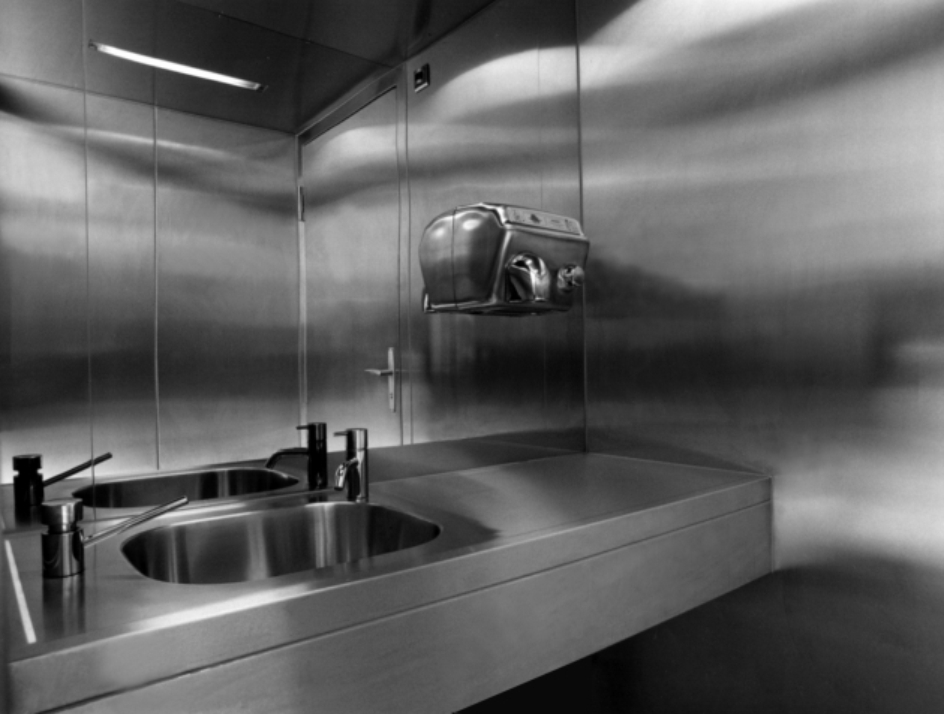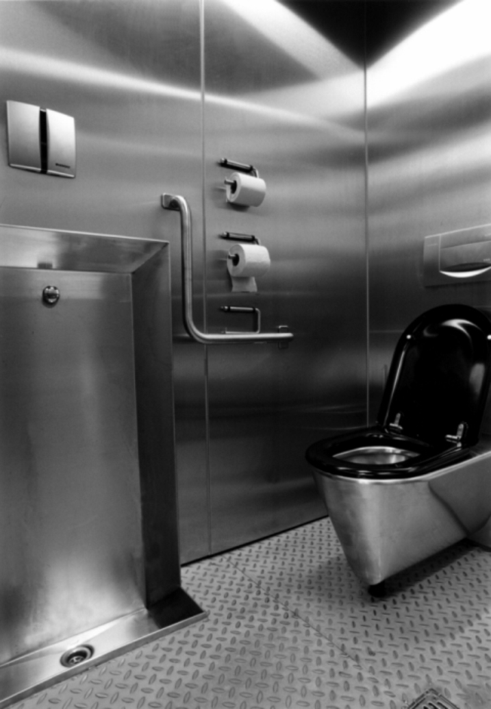 Für die Konstruktion der Hochbauten, deren Bodenoberfläche und Innenverkleidungen wurde Edelstahl gewählt - die so erreichte Homogenisierung der Oberflächen betont den konstruktiven Charakter der Bauten.