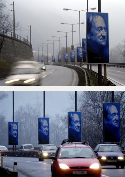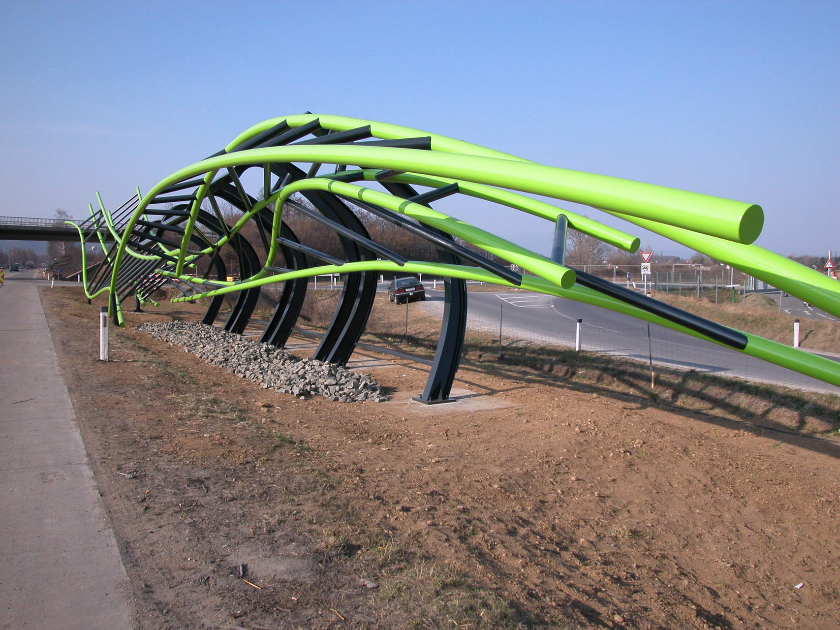 „Hands-out“, 240 winkende Hände empfangen (verabschieden) die Autofahrer auf der A9. Mit ihrer 100 Meter langen Installation (die Kunsstoffarme sind nach dem Prinzip des „Wackeldackels“ beweglich auf einer drei Meter hohen Wandkonstruktion montiert) paraphrasiert die Gruppe x architekten mit Peter Reitmayr und Wolfgang Haas die archetypischste aller Grußgesten. Die Bewegung der Hände wird vom Fahrtwind der vorbeibrausenden Autos gesteuert, verändert sich also mit der Intensität oder Trägheit des Verkehrsaufkommens. Die Autofahrer sind Betrachter und Akteure zugleich. Das bedeutet: sollte alles im Stau stecken, erlahmt auch die Begegung des Winkens. Grußlos wird man stehen gelassen... (Text: Gabriele Kaiser)