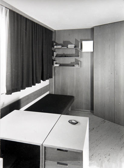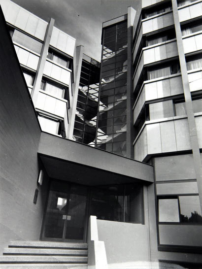 Der konstruktive Gedanke außen liegender Stützen gewährleistet größte Flexibilität in der Grundrissausbildung, womit den Voraussetzungen des Großraumes der Mensa ebenso wie der Kleingliedrigkeit der Wohngeschoße für jeweils 21 Studenten entsprochen wurde.