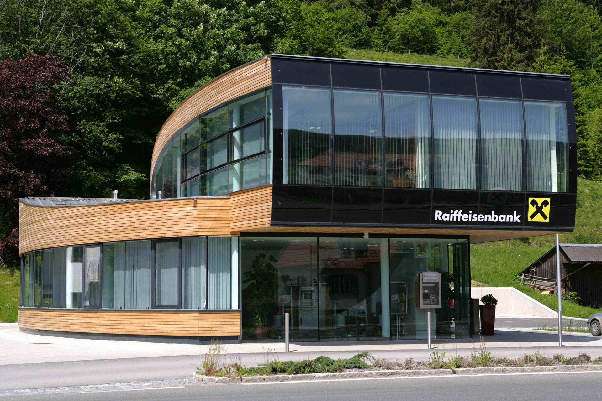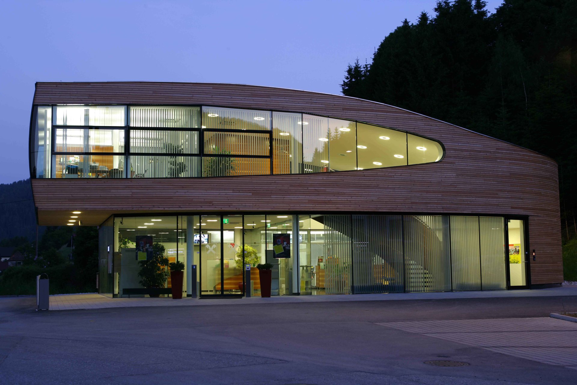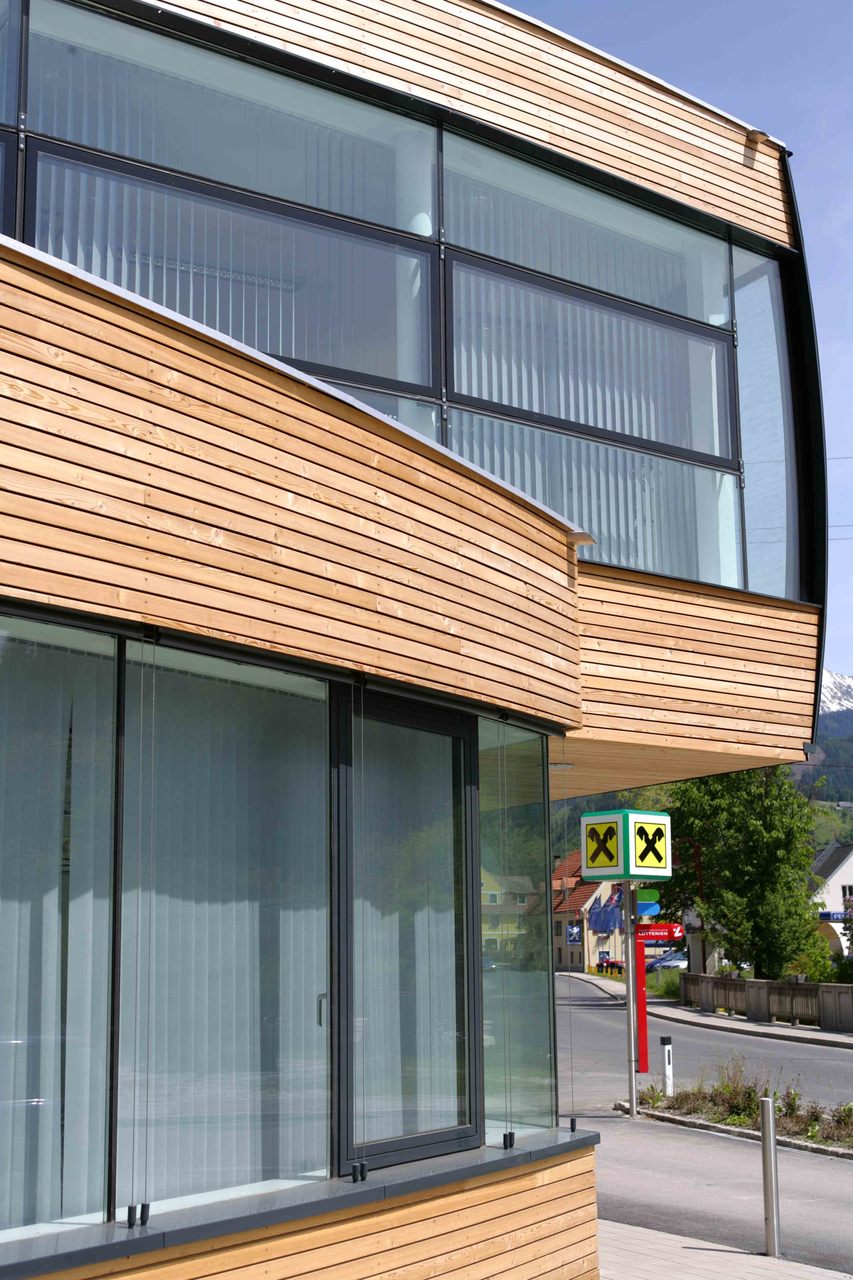 Die gebogene Lärchenholzverkleidung verstärkt die Bewegung der Rundform und stellt in ihrer Materialität einen direkten Bezug zur stark bewaldeten Landschaft der Umgebung her, die ebenfalls gebogene Glasfassade des oberen Geschosses vermittelt Transparenz und stellt gleichzeitig einen Bezug zum Hauptbankgebäude in der Stadt Judenburg her und ist somit architektonische Umsetzung des Corporate Design.