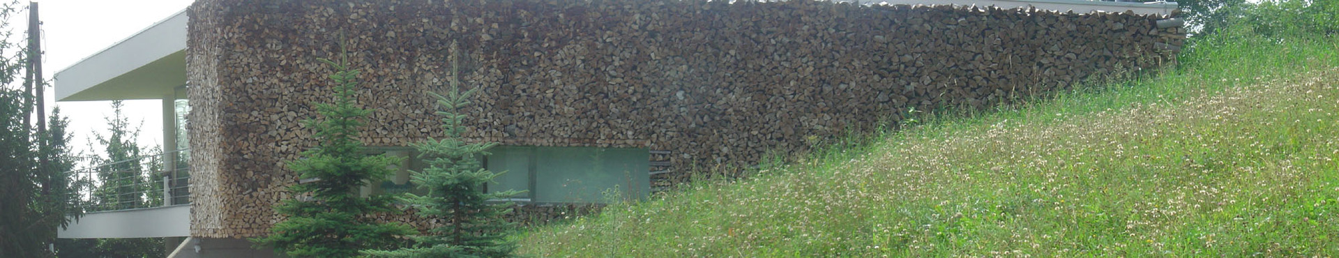 Der Glaskörper, eingeschrieben in einen Rahmen aus zwei relativ massiven horizontalen Platten, die im Vergleich schlanke Stützen tragen, erweckt Assoziationen mit Villen der Klassischen Moderne. Die in Holzscheite eingepackte Rückseite des Gebäudes, gleichzeitig Tarnung und Schutz vermittelnd, lässt auf den ersten Blick nicht auf die Offenheit und Eleganz der anderen Seite schließen.