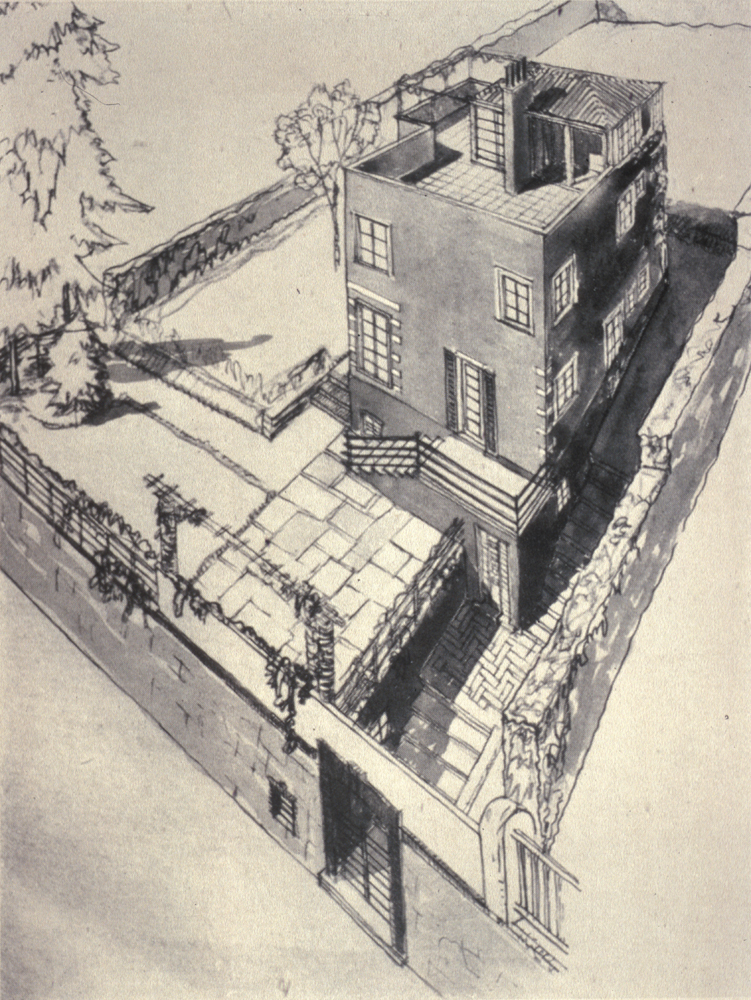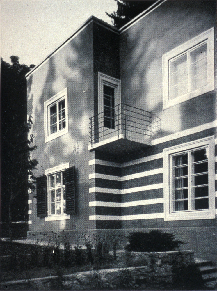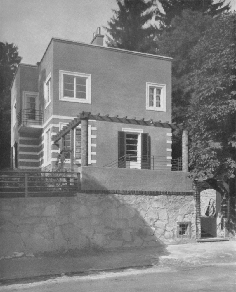 Über einer Bruchsteinmauer erhebt sich am Hang der kubische Block des kleinen Einfamilienhauses. Das Ziegelrot der aktuellen Färbelung verfälscht etwas den ursprünglichen Eindruck, war es doch laut Presse „sanft-erdbeerrot und weiß“ gestrichen. Die als Motiv der internationalen Moderne an die Hausecke gerückten Fenster werden durch die breite Rahmung, die traditionellen Proportionen und die heute verschwundenen, grün gestrichenen Fensterbalken wieder traditionellen Sehgewohnheiten angenähert. Die waagrechten Putzbänder des erhöhten Erdgeschosses spielen gleichermaßen auf das Prinzip der gründerzeitlichen Fassade mit Sockelzone wie auf die Betonung der Horizontalen im Neuen Bauen an.