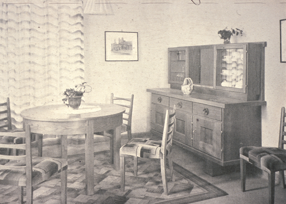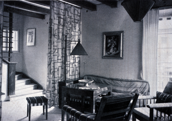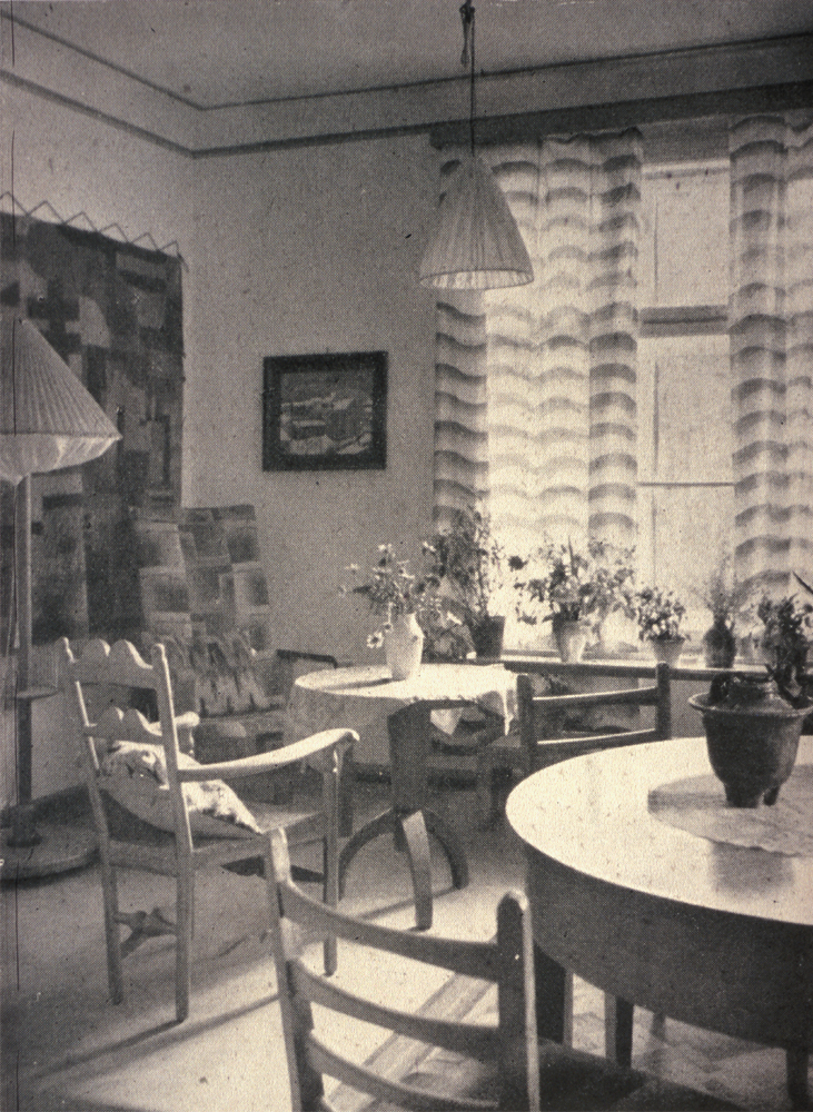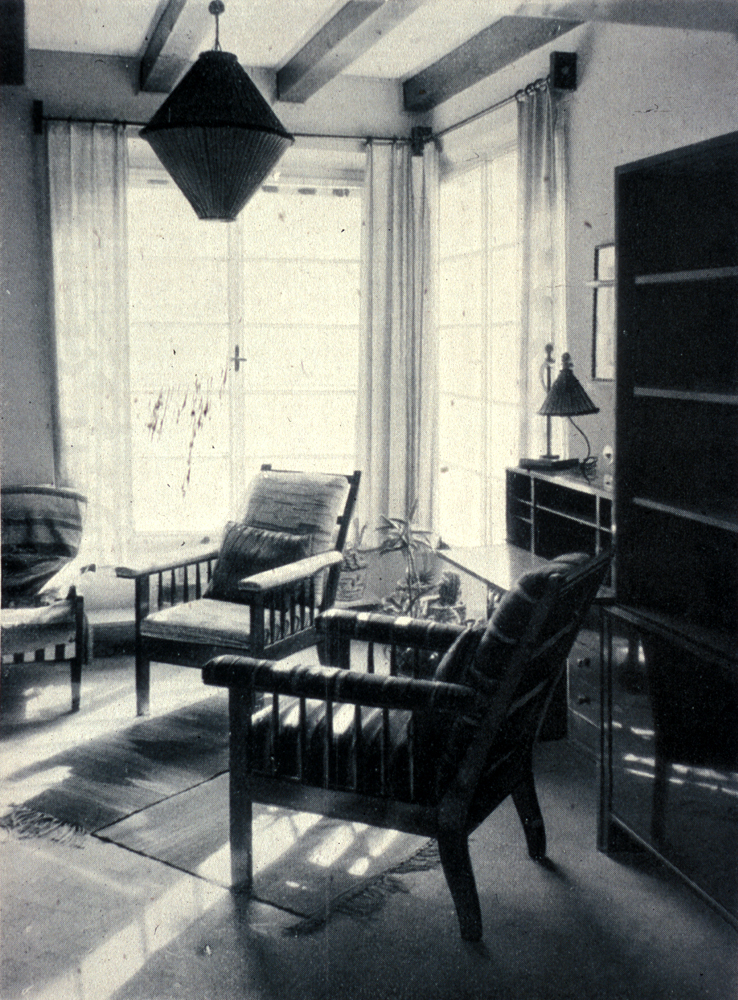 Die gesamte Innenausstattung, von den Möbeln, Lampen, Vorhängen, Teppichen bis zur Keramik und den Bildern an den Wänden, wurde eigens für diesen Bau entworfen. Die an historischen Möbelformen orientierte, gutbürgerlich-gediegene und bewusst „wohnliche“ Einrichtung, großteils in Holz, stand in drastischem Gegensatz zu den kühlen Stahlrohr-Interieurs der Weißenhof-Siedlung.