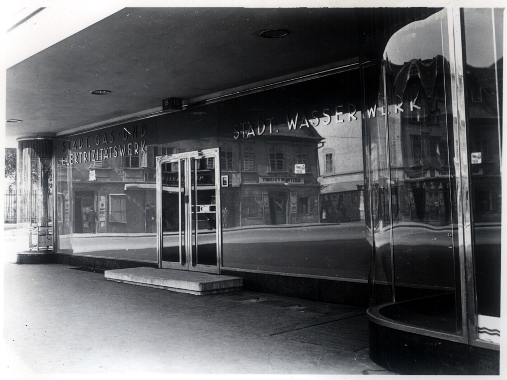 Im Vordergrund stand nach Steinbüchel-Rheinwalls Vorstellung eine ausgeprägte Funktionalität, die auf den „Service-Charakter“ des Baus Rücksicht nahm. So reagierte er auf die Vorgabe des Auftraggebers, die getrennten Verwaltungseinheiten Gas- und Elektrizität sowie Wasserwerk als zwei gleichwertige Bereiche mit gemeinsamer Vorhalle zu verbinden, mittels eines erhöhten, in ein kleinteiliges Raster aufgelösten Treppenturms, der gelenkartig die horizontale Bänderfassade der beiden Flügel auf dem L-förmigen Grundstück vereint.
