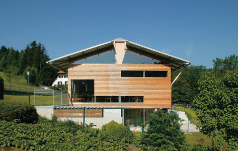 Eine Basis aus Stahlbeton bildet das halb im Terrain situierte Untergeschoss und die Südwand des Neubaus. Darauf lagern die Außenwände aus vorgefertigten Massivholzelementen und die ebenfalls massiv ausgebildeten Dachflächen. Die spezifische Form der Stützenköpfe, die sich aus der beidseitig außen liegenden Krafteinleitung als Folge des zur Gänze verglasten Firstes ergeben, transportiert zusätzlich die flächige Elementbauweise mit hohem Vorfertigungsgrad und trägt ihrerseits zum spezifischen Charakters des Gebäudes bei.
