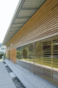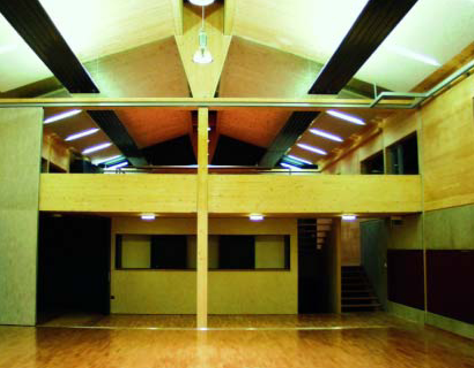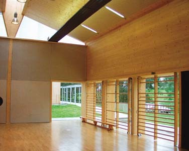 Im sensiblen Ineinandergreifen von topografischen und funktionalen Anforderungen - Nutzung als Sport- und Musikvereinsstätte, als Fest- und Konzertsaal sowie als Veranstaltungs- und Ausstellungshalle - schaffen die Architekten einladende, vielfältig nutzbare Räume von außerordentlicher Raumqualität. Flexibel können die einzelnen Räume durch Öffnen oder Verschließen einer raumhohen, mobilen Trennwand einander zugeordnet werden, halbgeschossig versetzt schließen die Räumlichkeiten für den Musik- und Sportverein an.