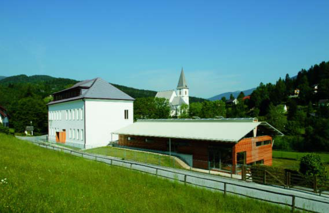 Durch ein Verbindungsgelenk an den Altbau angeschlossen hebt sich der Zubau zwar in Bezug auf Form, Material und Proportion bewusst vom Altbestand ab, erzeugt aber durch seine zeitgemäße Interpretation ländlicher Elemente, wie sie vor allem in der Ausbildung des Daches augenfällig wird, einen anregenden Dialog und transportiert zeichenhaft eine neue Schulphilosophie.