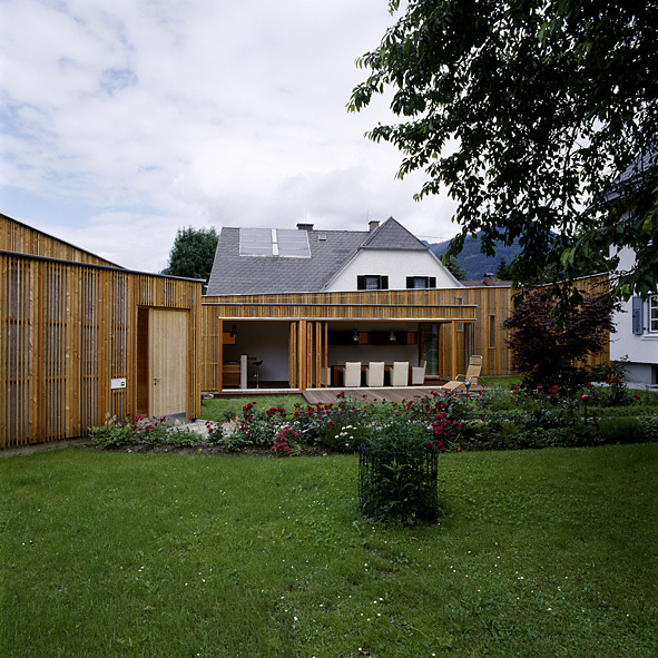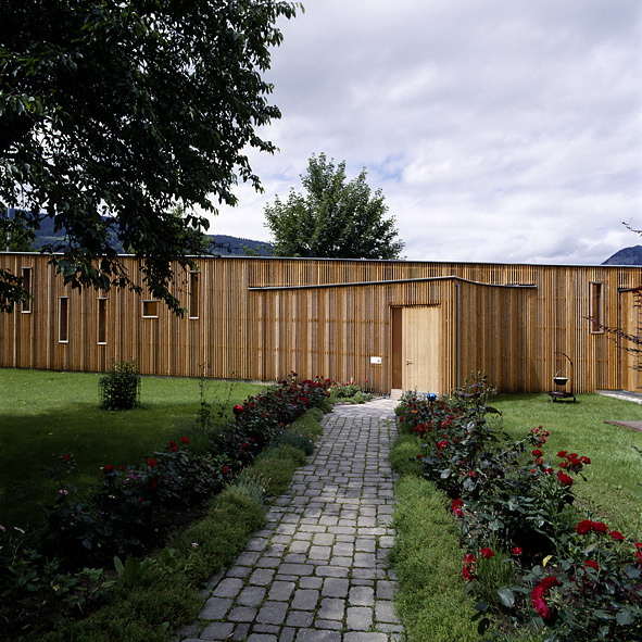 Von weitem erscheint die Wand homogen, aus der Nähe betrachtet löst sie sich jedoch in eine wellenartige Struktur auf. Die Lärchenlamellen der „Fassade“ sind verlaufend in Winkeln von 90° bis 30° gedreht, so dass eine Streuung der auf sie treffenden Schallwellen gewährleistet wird. Auch der Eingang ist so gestaltet, dass selbst bei geöffneter Tür wenig Straßenlärm in den Garten dringt.
