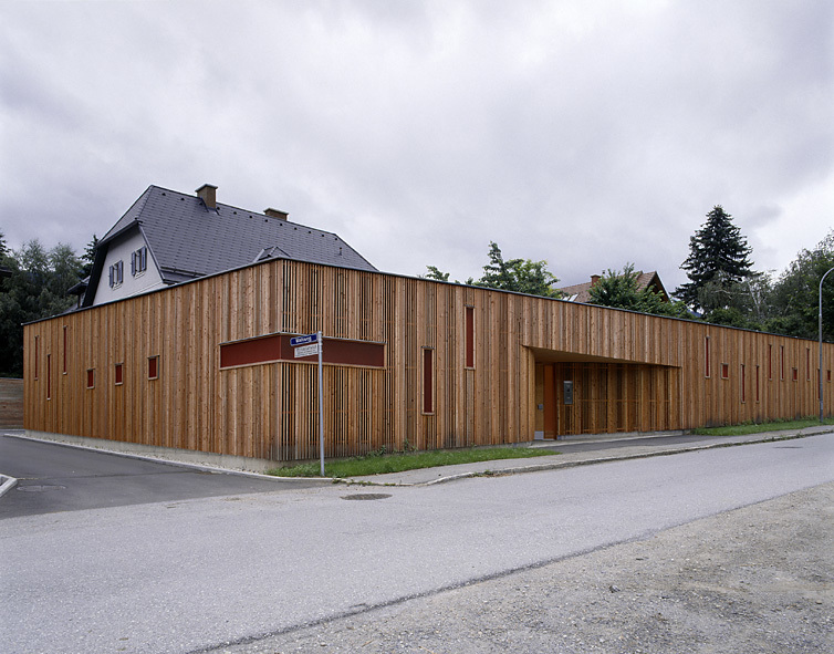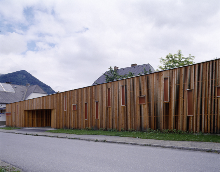 Farbige Fensteröffnungen in wechselnden Formaten unterbrechen die Holzriegelwand in regelmäßigen Abständen und lassen den Passanten zweifeln: Handelt es sich wirklich nur um eine Wand oder doch um ein Gebäude? Die farbigen Fenster erscheinen je nach Sonnenstand transparent oder opak und unterstützen diesen ambivalenten Charakter.