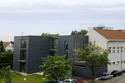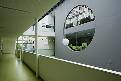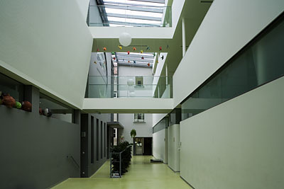 Aus diesen Vorgaben sowie der Intention nach möglichst differenzierten Raumerlebnissen (Bildung) und kurzen Wegen (Kosten) ergab sich die Parallelstellung eines Bauplatz sparenden, kompakten, dreigeschossigen Baukörpers. Die Schnittstelle zwischen Bestand und Neubau bildet eine 12 m hohe überglaste Halle, Brücken und Stege verbinden die beiden Baukörper, alt und neu stehen in einem ablesbaren Spannungfeld zueinander.