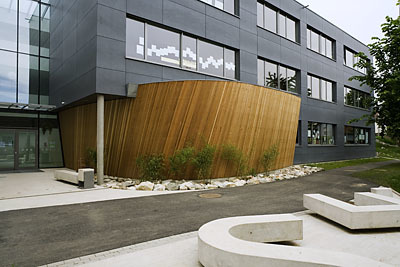 Die geschwungene Holzwand im Eingangsbereich weist auf den versteckten Haupteingang hin, bricht die wirtschaftliche Strenge des Zubaus und gibt dem repräsentativen Medien- und Veranstaltungsraum seine Form.