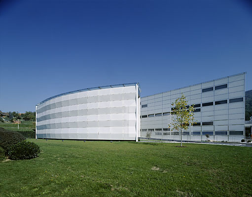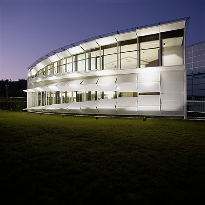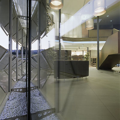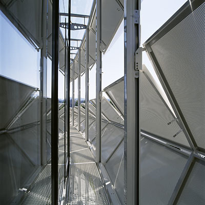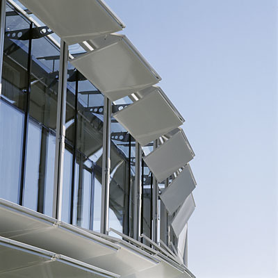 Tragende Elemente sind an der polygonalen Glasfassade befestigte Edelstahl-Schwerter, auf die senkrechte Edelstahl-Führungsschienen montiert wurden. In diesen Schienen befinden sich die Rollapparate und Elektro-Getriebemotoren, die mittels Laufwagen und speziellen Lagerungen 112 Elemente bewegen. Die beweglichen Teile bestehen aus perforierten, pulverbeschichteten Leichtmetall-Kassetten, die von den insgesamt 56 Motoren und einem BUS/SPS-Steuerungssystem in allen drei Dimensionen stufenlos bewegt werden können.