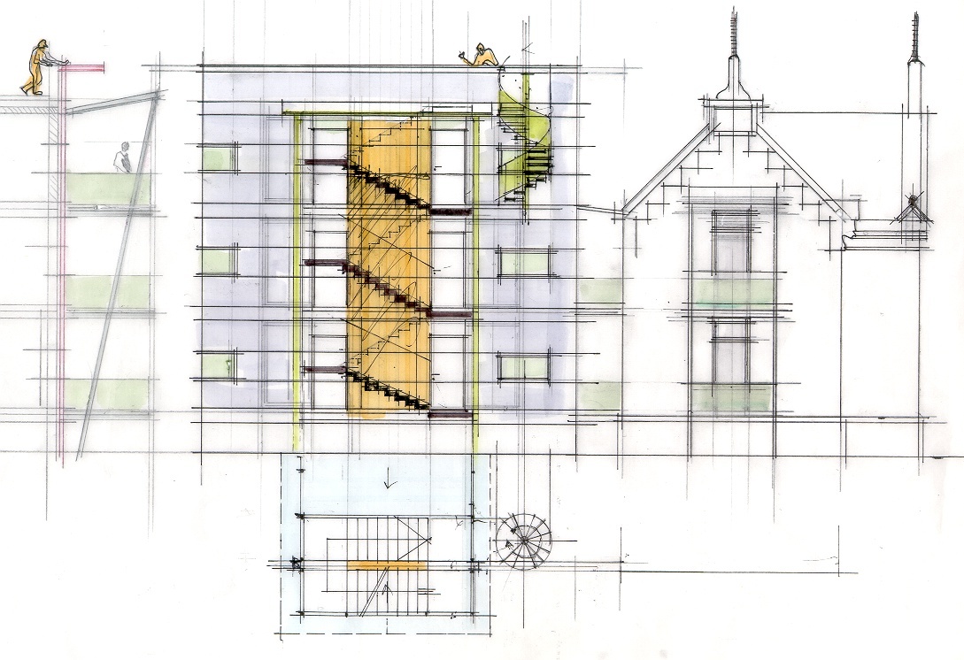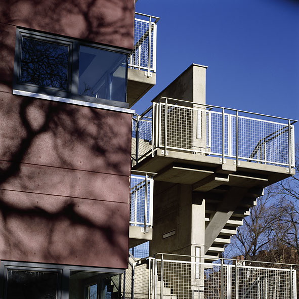 Durch das neue Erschließungskonzept mittels eines freistehenden Stiegenhauses und Laubengängen für beide Häuser gelang eine Erhöhung der Wohnungsanzahl von 6 auf 10, wobei nur ein Geschoss aufgestockt werden musste.