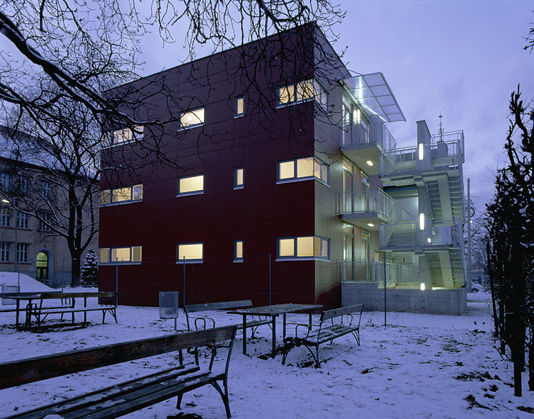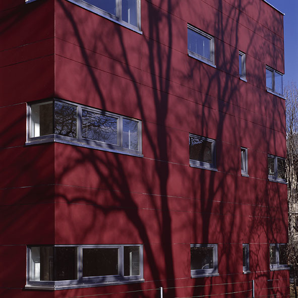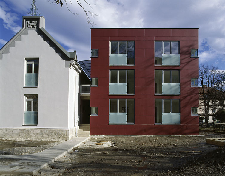 Aufgabe war die Um- und Neugestaltung eines neugotischen Bauwerkes in einem Park, dessen Südseite ein markanter Schulbau aus den 1930er Jahren dominiert. Da wesentliche Stilelemente der historischen Bausubstanz bereits im Zuge einer Renovierung verloren gegangen waren, entschied man sich, den substantiell wertvolleren Westtrakt des Gebäudes behutsam zu sanieren und den zum Park hin orientierten, später angebauten Hausteil als eigenständigen Baukörper in zeitgemäßer Formensprache umzugestalten. Der neue würfelförmige Hausteil geht auf Distanz und betont in der Wahl der Materialien, der Detail- und Farbgestaltung seine unterschiedliche Haltung.Fenster und Türelemente sind flächenbündig in die Fassade aus roten Platten gesetzt und verstärken den monolithischen Charakter des schlichten Kubus, das Treppenhaus aus Sichtbeton ist als technisches Element additiv an das Haus angedockt; ebenso Laubengänge, Flugdächer und Brüstungen.