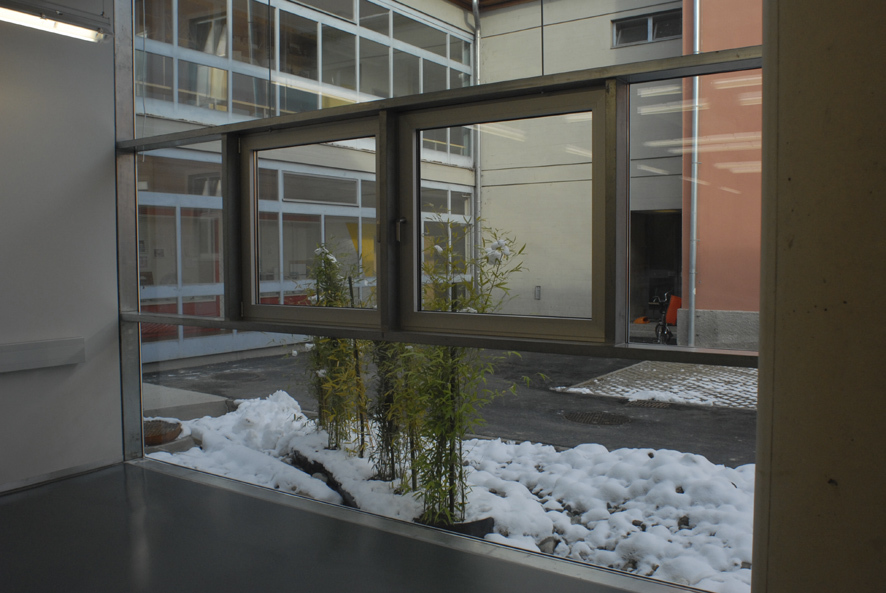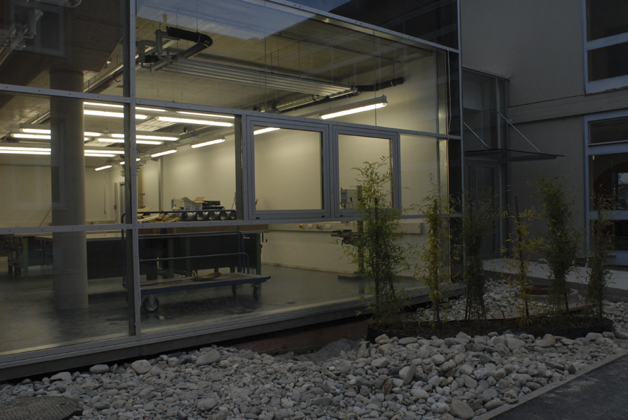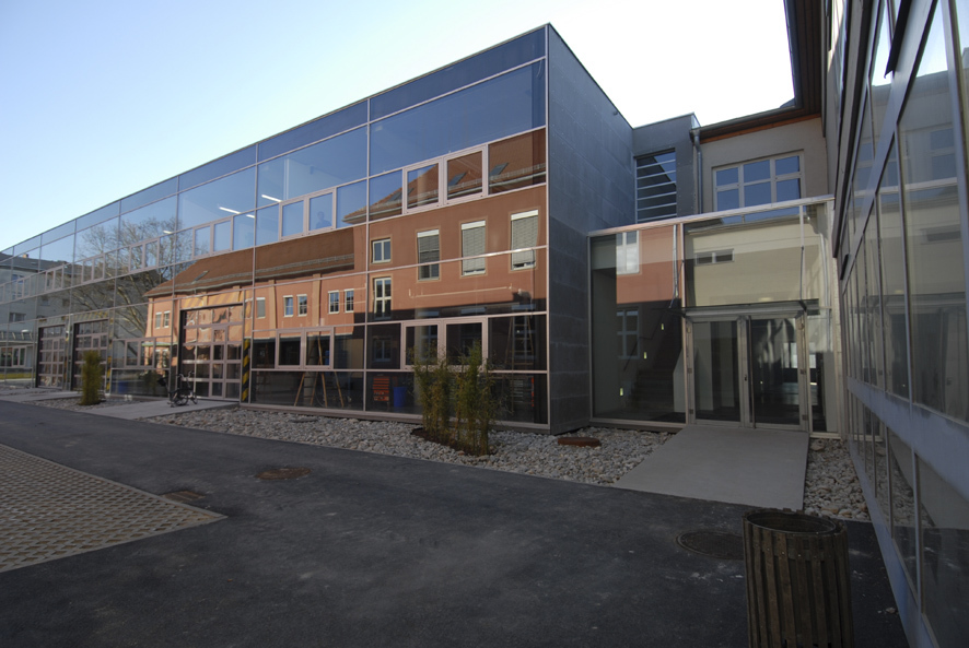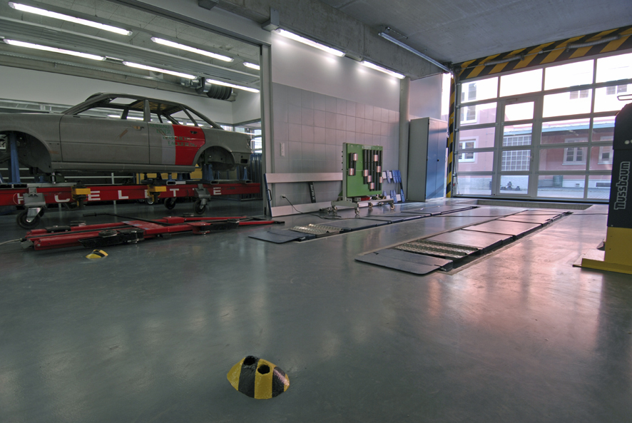 Sparsam durch Reduktion auf das Wesentliche: Anstelle eines verbrauchten, baufälligen Gebäudes wurde eine neue Werkstättenhalle errichtet. Eine klare Gliederung, Großzügigkeit durch Transparenz, einfache Materialien sowie die sichtbare Technik zeichnen den Neubau aus, der in seiner Schlichtheit Wirkung entfaltet und dabei keineswegs billig wirkt, die sichtbare Technik als Gestaltungselement erfrischt die Nüchternheit des Funktionalen.Der Stahlbeton-Skelettbau ist mit einer geschlossenen Wand nach Westen versehen, die für das Weiterbauen mit einer Vielzahl von vorbereiteten Öffnungen ausgestattet ist, die Fensterfront ist eine Metallfassade aus verzinkten Stahlelementen.