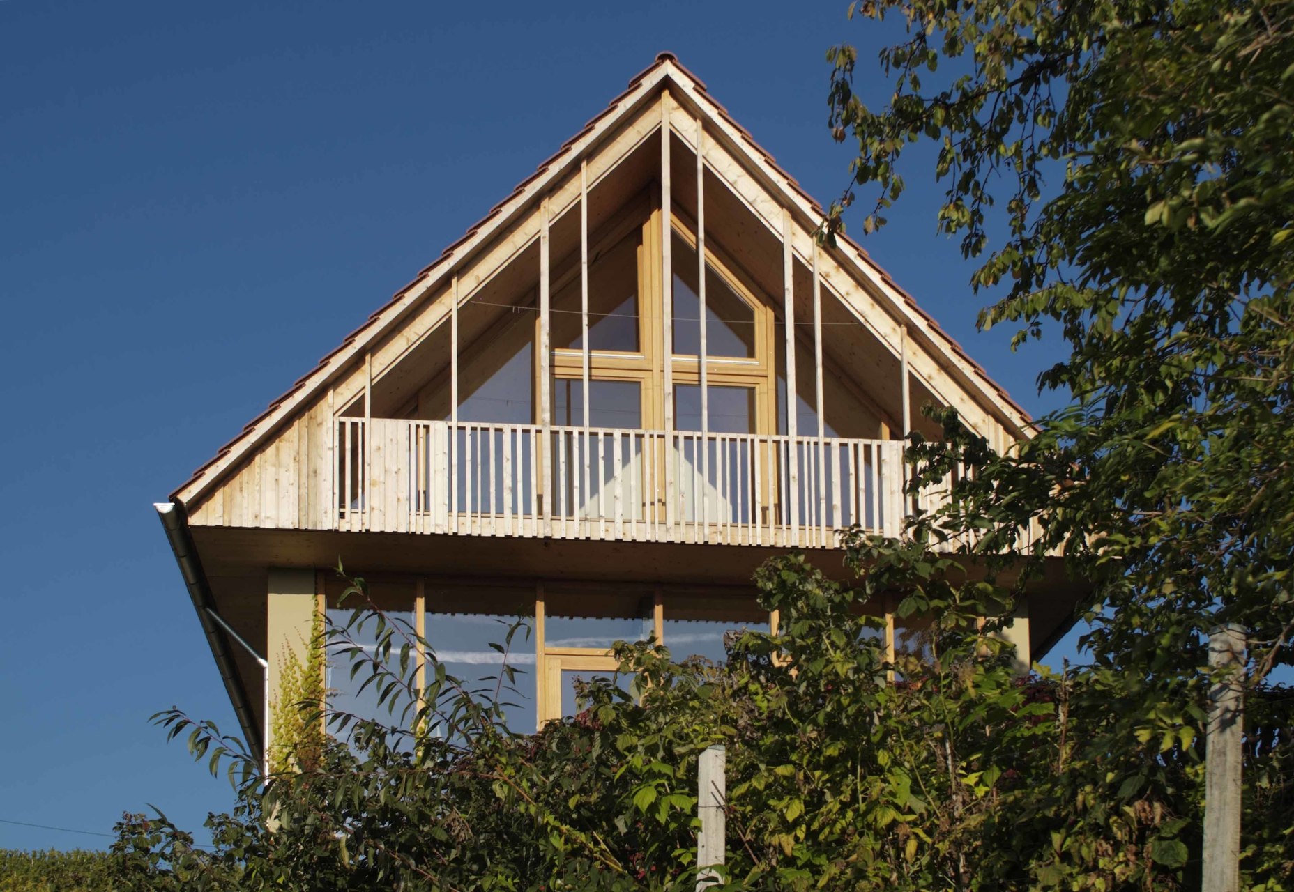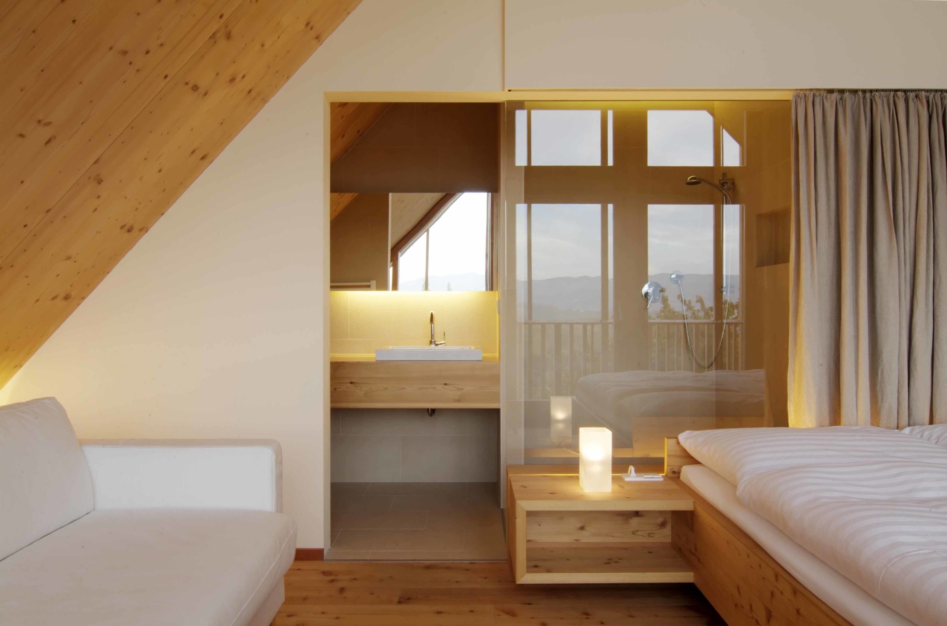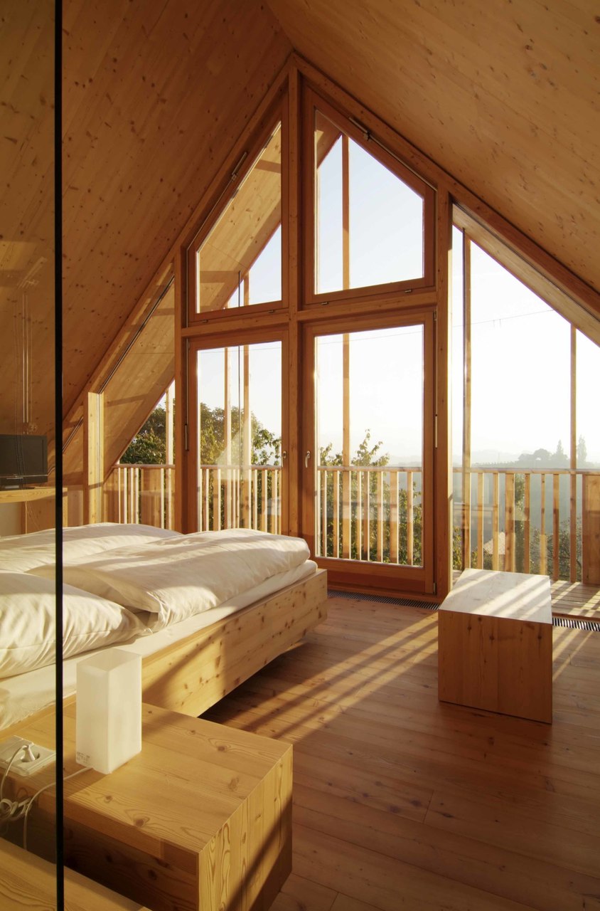 Rohes, sägeraues Holz, Stein und unbehandelter Stahl sind die verwendeten Materialien. An den Fassaden überwindet die Art und Weise, wie Holz zum Einsatz kommt, spielerisch die selbst verordnete Traditionalität. (Nach einem Text des Architekten)