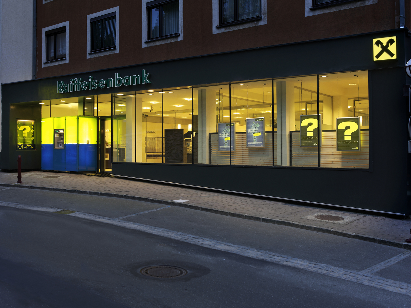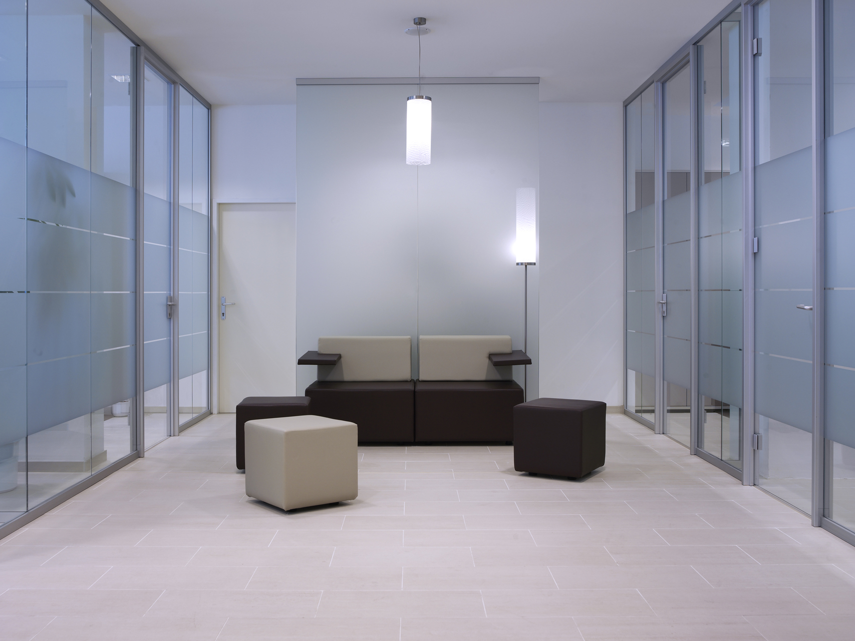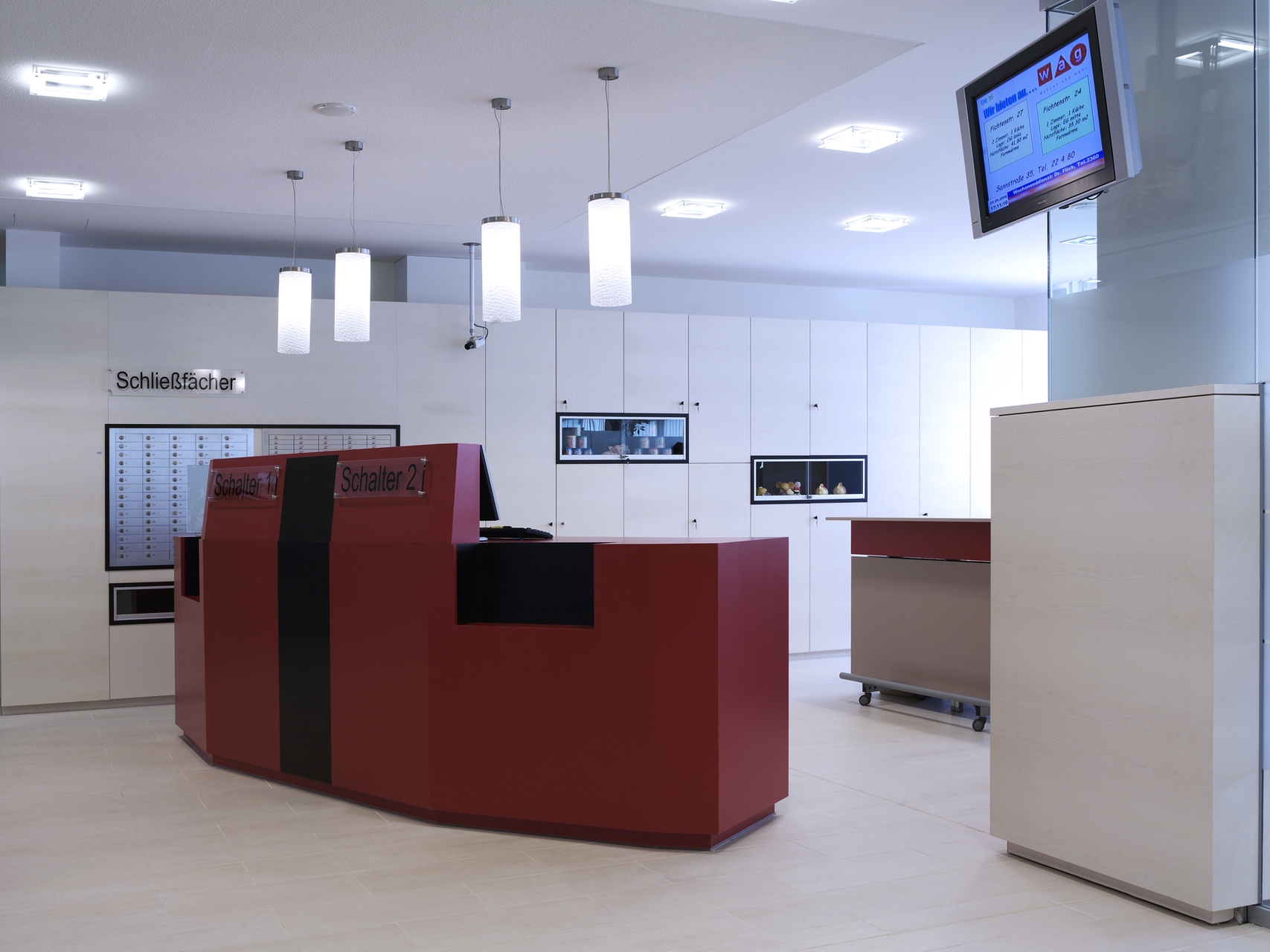 Möbel mit - für eine Bank notwendigen - integrierten Geräten fungieren als Raumteiler und sind so im Raum verteilt, dass sie die Außenwände nicht berühren. Auf ihnen sitzen Glastrennwände, welche die Lücken zu den Außenwänden schließen und die Bereiche zur Wartezone gliedern. Böden, Wände und Decken sind in hellen Farben gehalten, um den großen, lichtdurchfluteten Raum freundlich zu gestalten. (Text: ArchitektIn)
