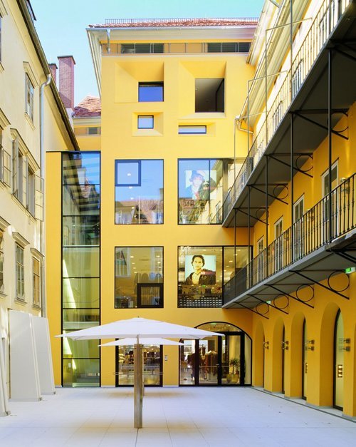 Die historische Struktur des Haupthauses an der Herrengasse im Zentrum der Innenstadt von Graz, der Hof mit den ehemaligen Pferdeställen und die Sichtachse von Herrengasse über den Innenhof zum Färberplatz, wurde durch den jetzigen Entwurf geklärt und wieder herausgearbeitet. Die Modernität der neuen Architektursprache fügt sich mit der bereits vorhandenen, bestehenden Substanz zu einem wirksamen Ganzen.